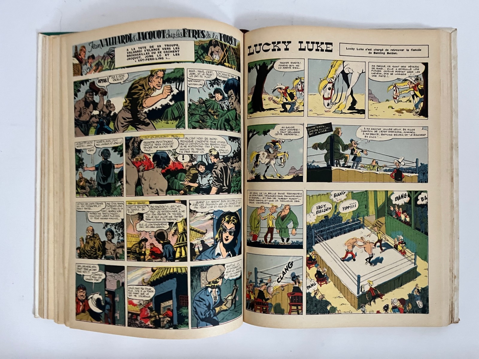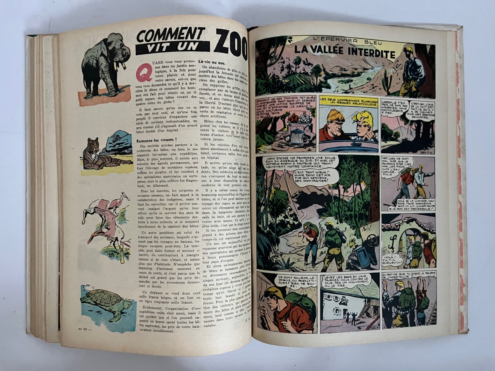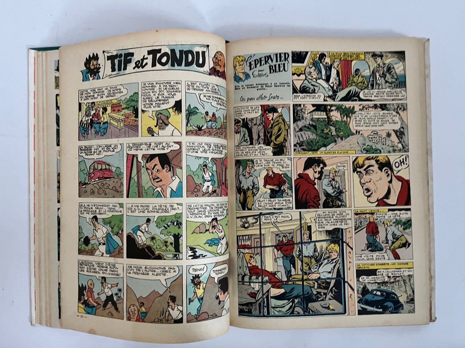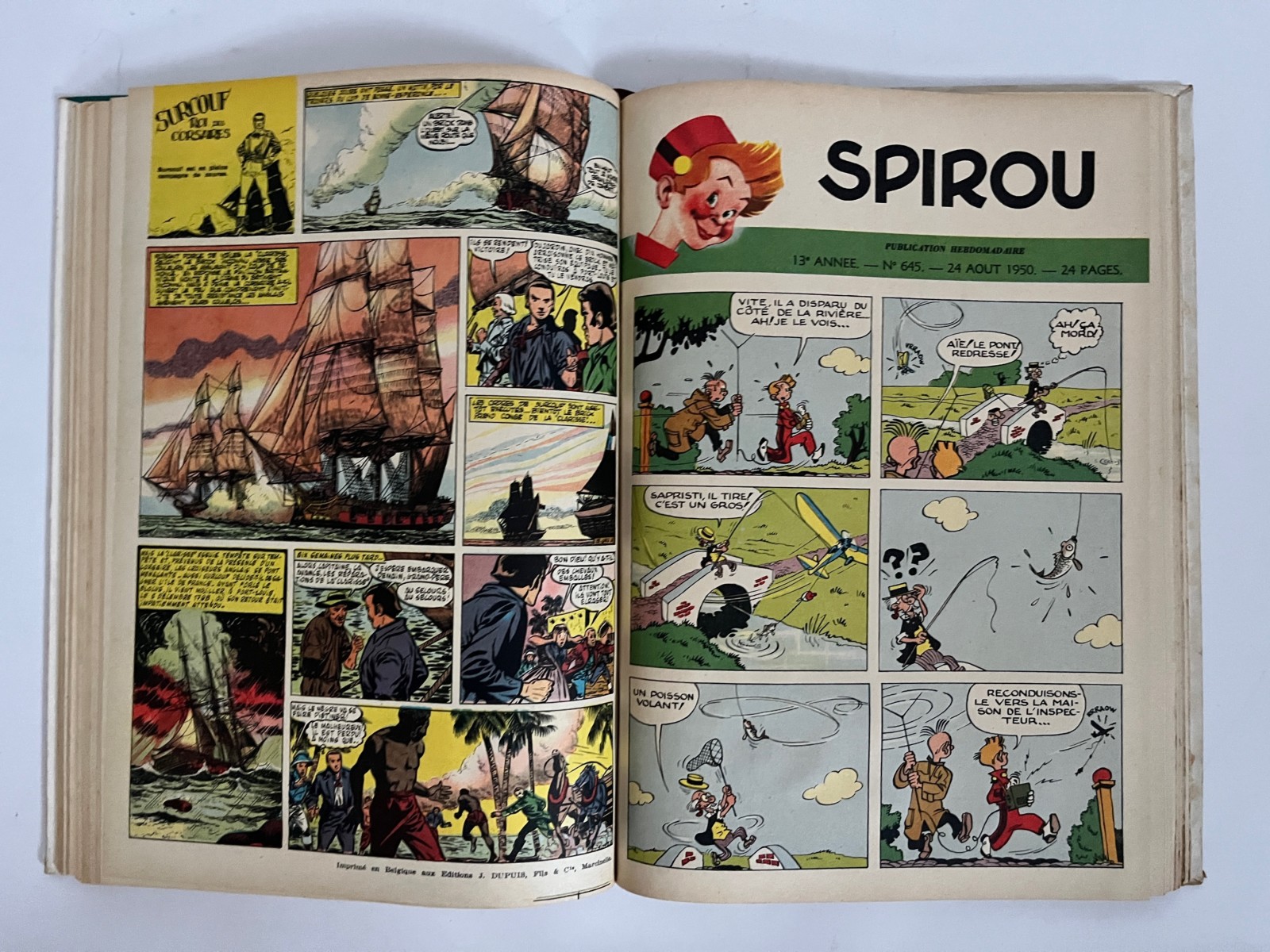 Très très bel état – Plats bien vifs avec légères traces du temps – Dos impeccable d’origine – La colle poisson du dos a classiquement déteint – Coiffes en bon état – Coins encore bien conservés – Tranches quasi non frottées – Intérieur très frais – Cahier intérieur bien homogène – Quelques légères tâches du temps – Coin inférieur des pages du fascicule N°647 (7/09/50) légèrement pliées – Pas d’autres pliures de lecture – Pas d’annotations – Pas de déchirures