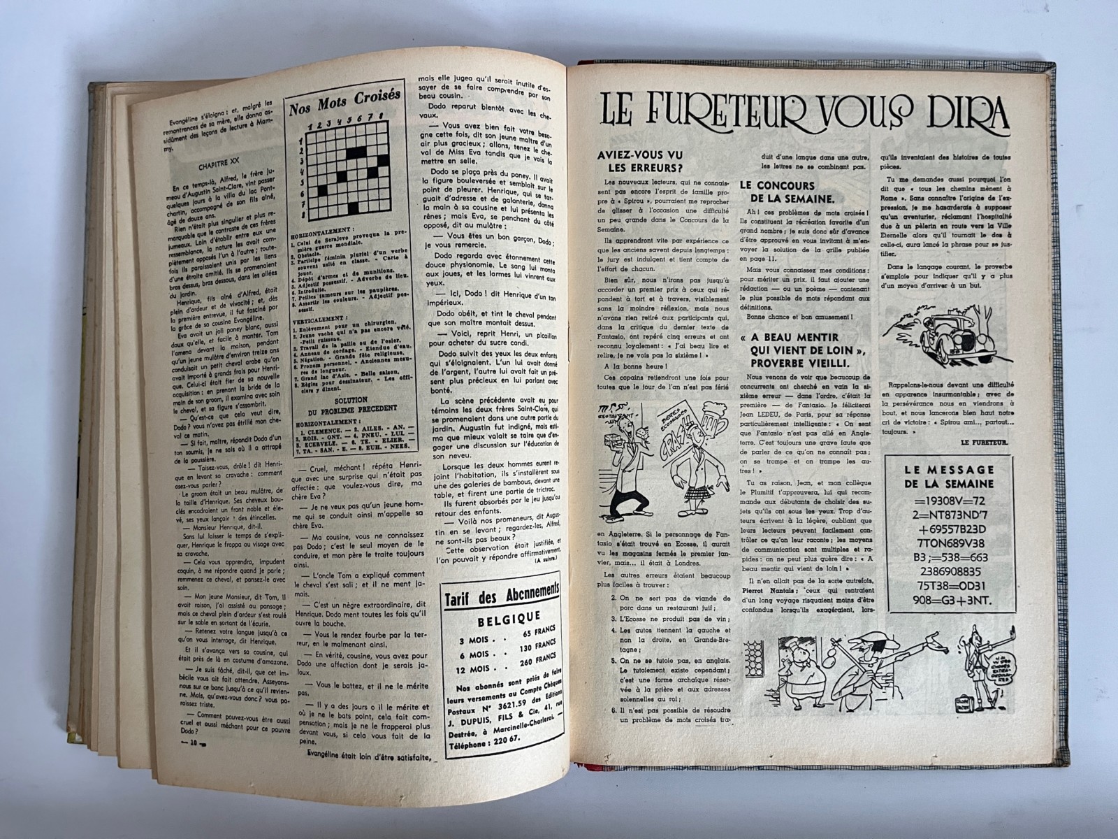 Très bel état – Plats bien vifs avec légères traces du temps – Dos d’origine en bel à très bel état, légères décoloration du rouge du dos dans le bas des pages de garde de début et de fin – Coiffes en bon état – Coins émoussés – Tranches un peu frottées – Intérieur encore bien frais – Cahier intérieur bien homogène – Quelques tâches de lecture – Pas de pliures de lecture – Pas d’annotations – Pas de déchirures – Les pages intérieures gondolent très légèrement suite à une conservation dans un endroit humide – Le recueil est toutefois aujourd’hui bien sec mais conserve une légère odeur de papier
