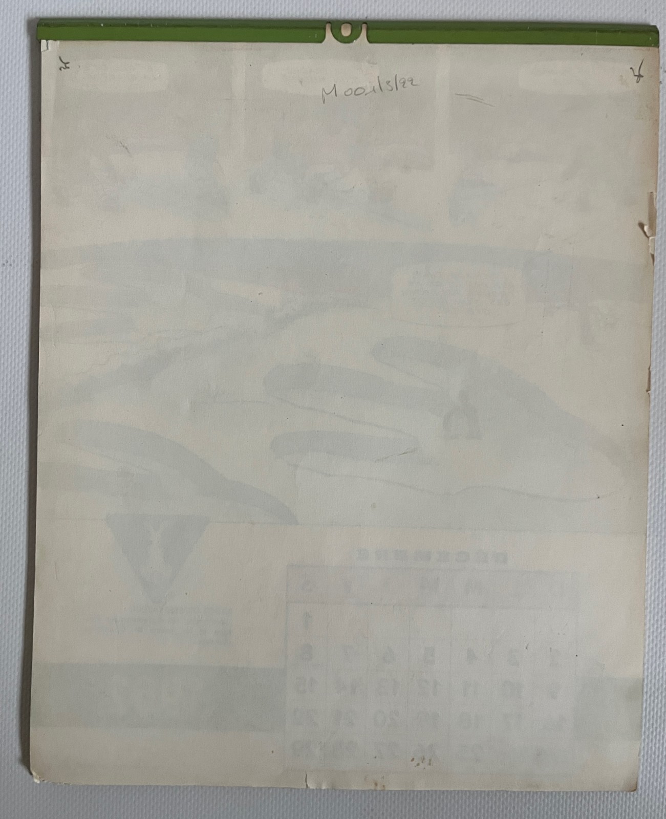 Calendrier 12 pages – Avec son cellophane protecteur et son système d’accroche en métal vert – Aucune écriture – 23X28,5 cm – Très très bel état