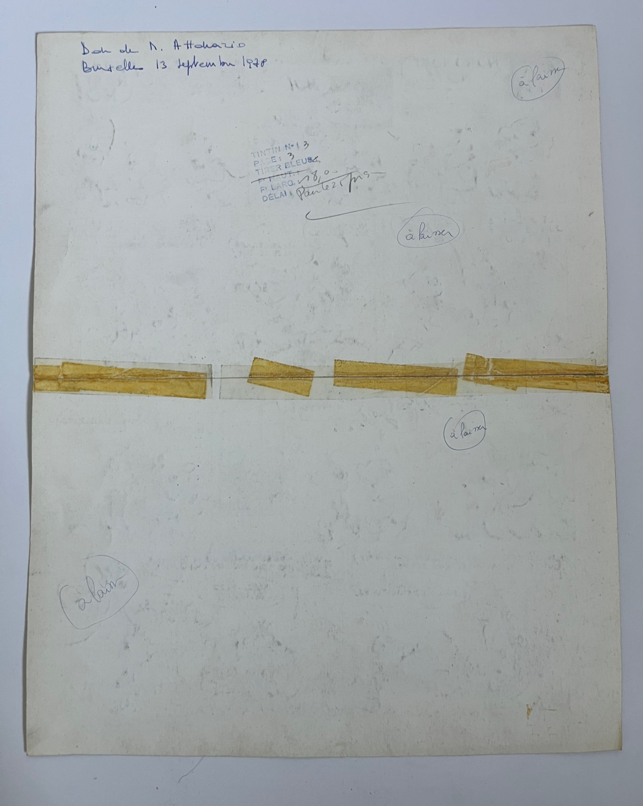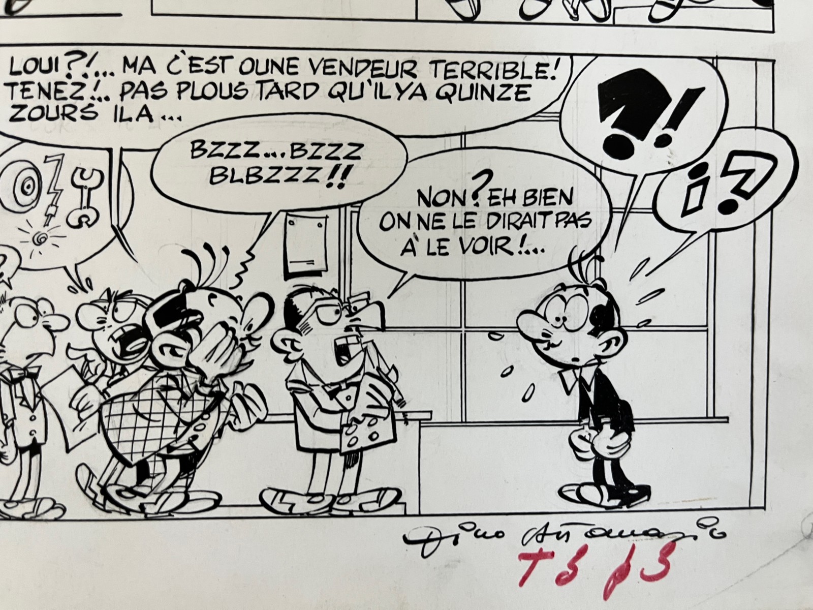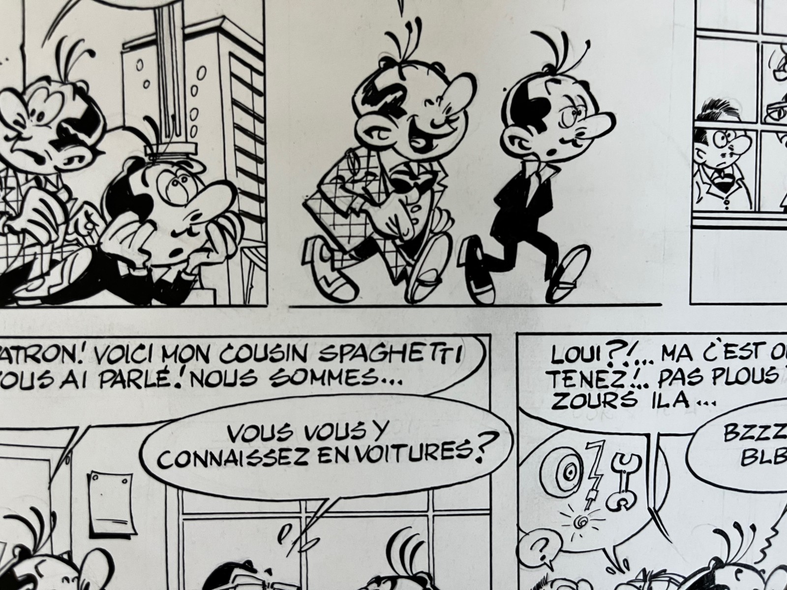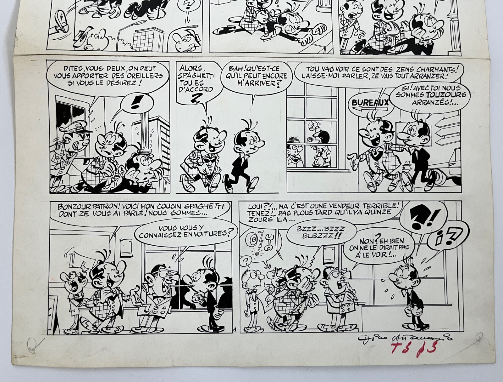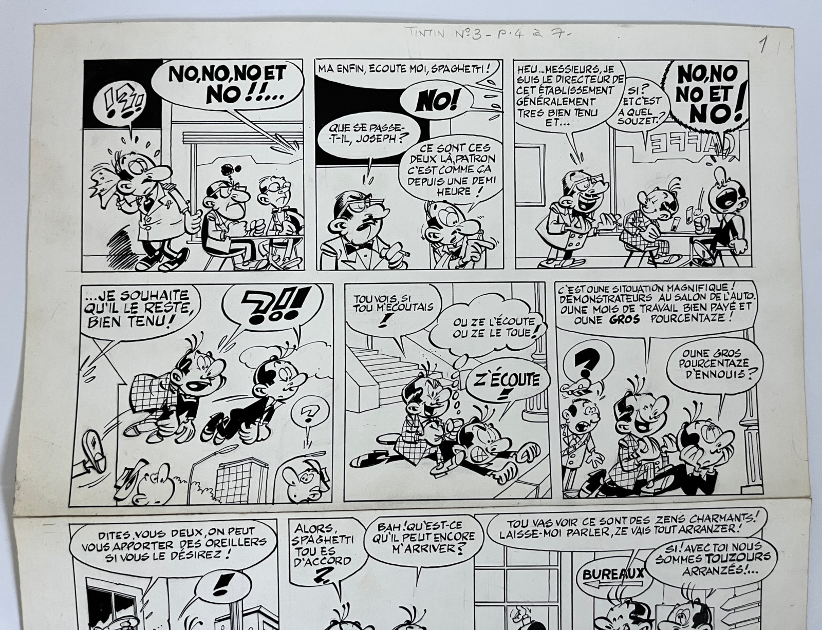 Page originale pour une histoire courte de Spaghetti parue dans le Journal Tintin – Encre de chine – Cachet du Journal Tintin à l’arrière avec indications de parution