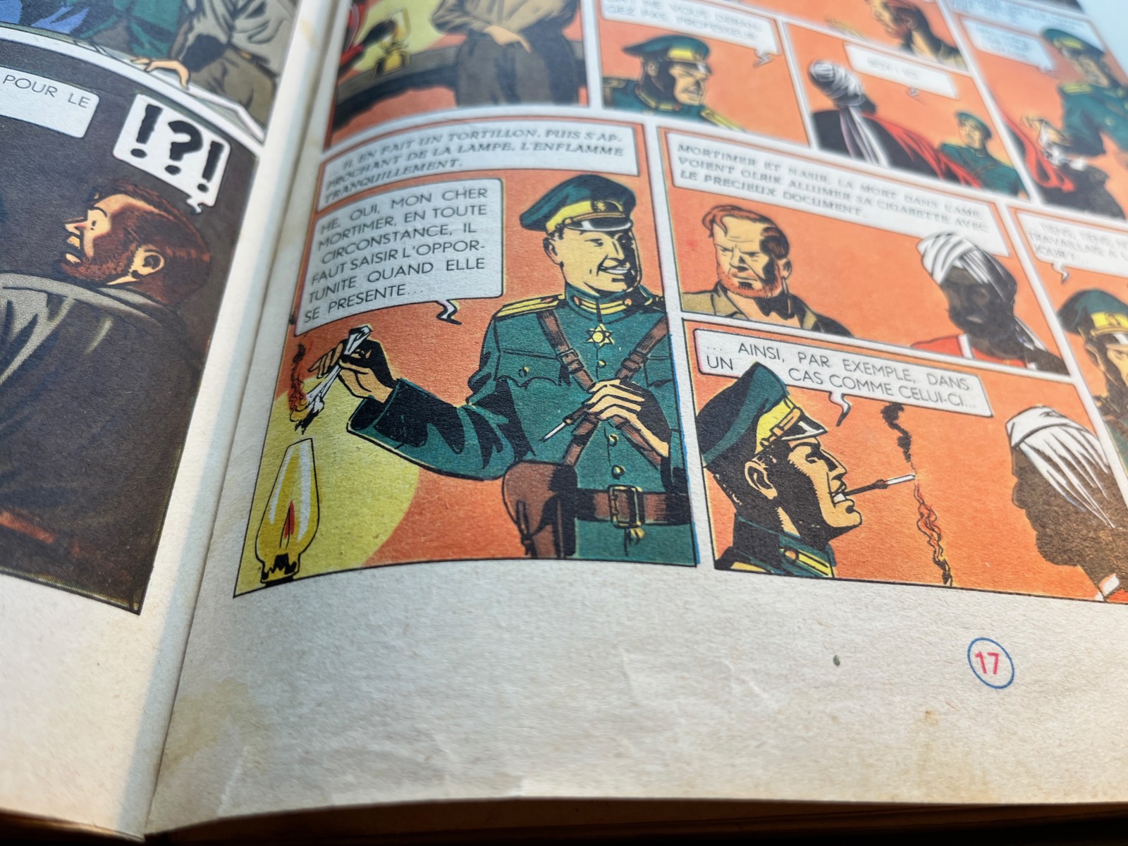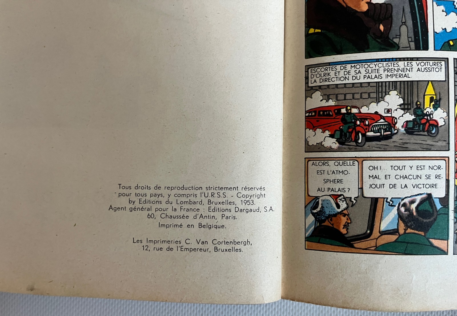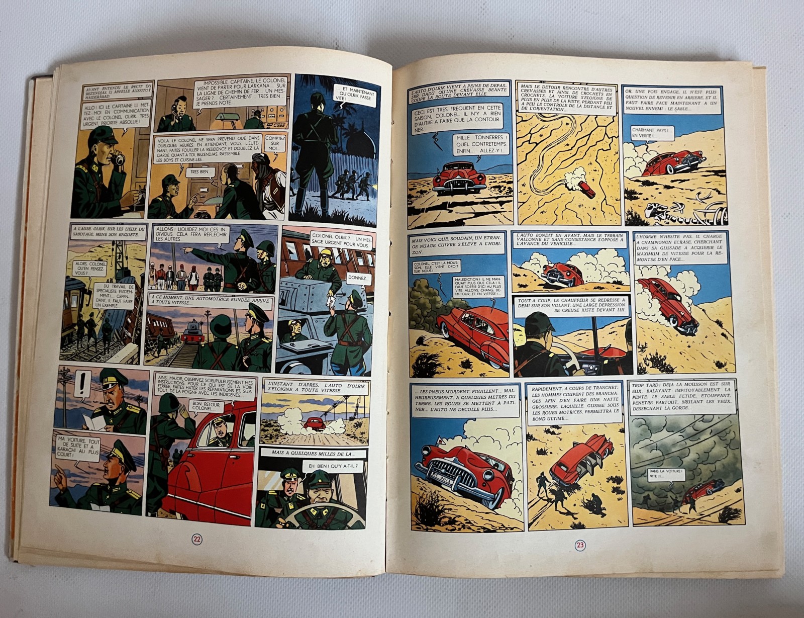 Album en bel à très bel état – Plats encore bien colorés avec quelques marques du temps – Coin supérieur droit au 1er plat restauré avec soin – 2e plat nettoyé avec soin – Tranches bien propres – Dos rouge et coiffes en très bel état – Pages intérieures avec plusieurs pliures de lecture et quelques tâches de lecture – On notera une déchirure au niveau du haut de la reliure entre les pages 8 et 9 – On observe également des petites déchirures de lecture dans le bas des pages suivantes: 15/17/31/33/47/59/65/73/79/81 et 83
