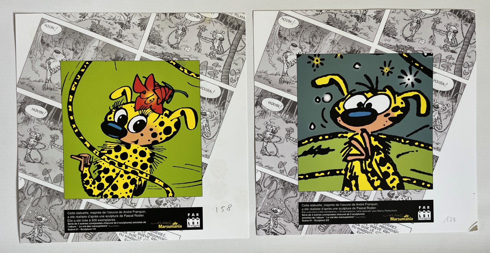 Tirage limité numéroté /500 exemplaires – Avec leurs certificat (petite pliure coin inférieur droit du certificat du Marsupilami) et numérotation sous les figurines – Dans leurs boites jaunes d’origine