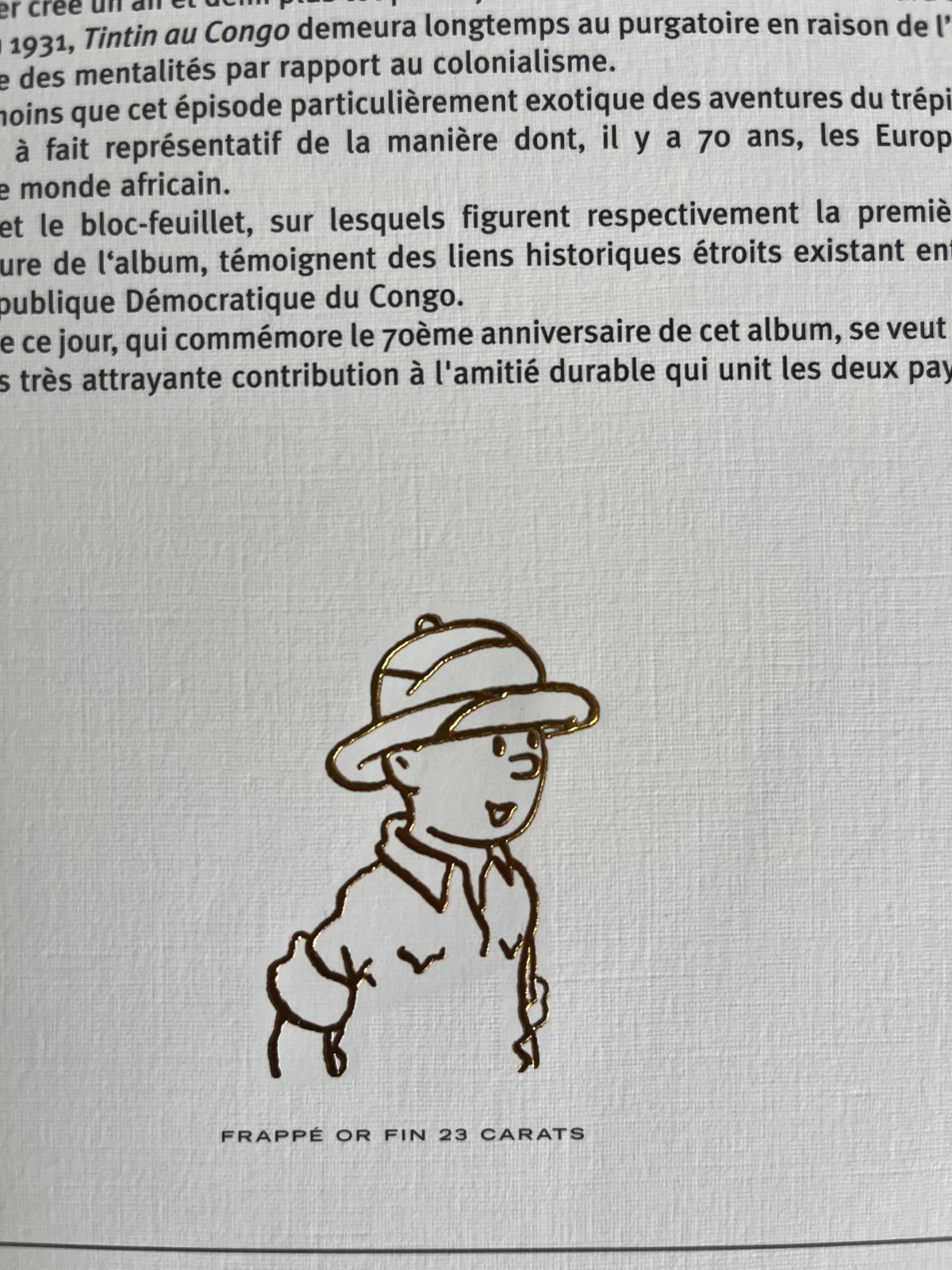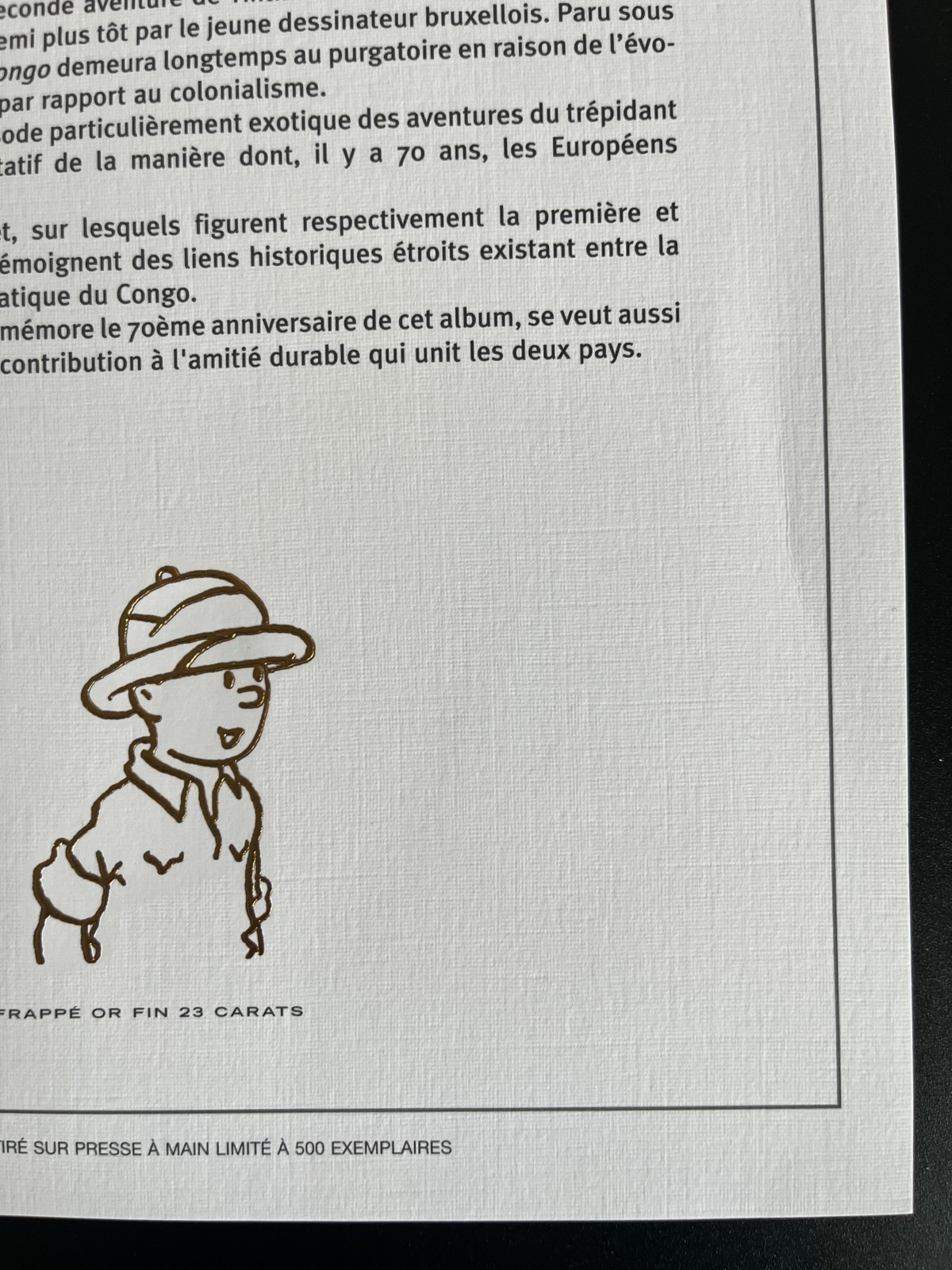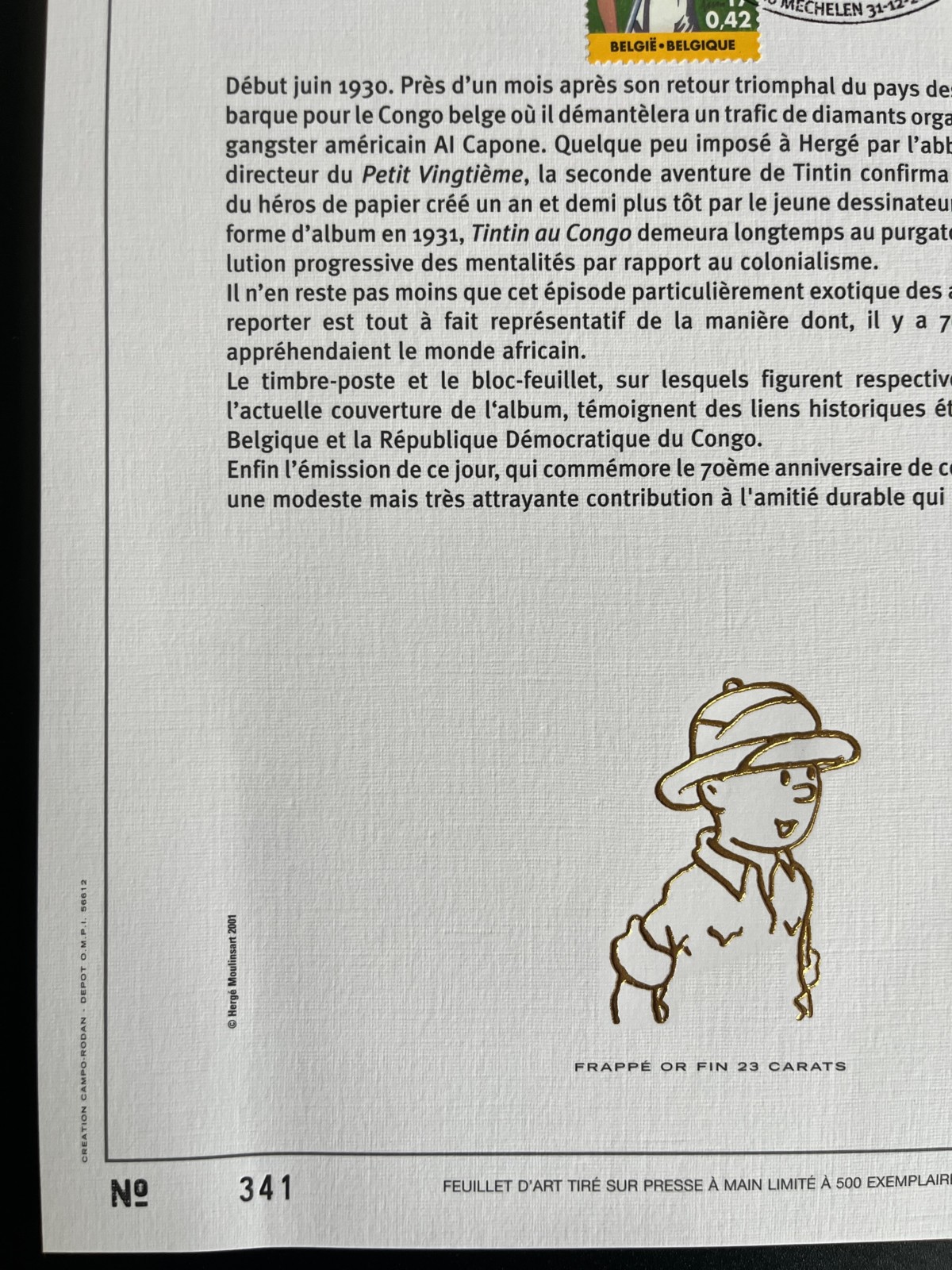 – Feuillet d’art tiré sur presse à main – Avec Tintin frappé or fin 23 carats – Tirage limité numéroté /500 exemplaires – Une petite pliure tranche de droite et bas de la tranche de gauche