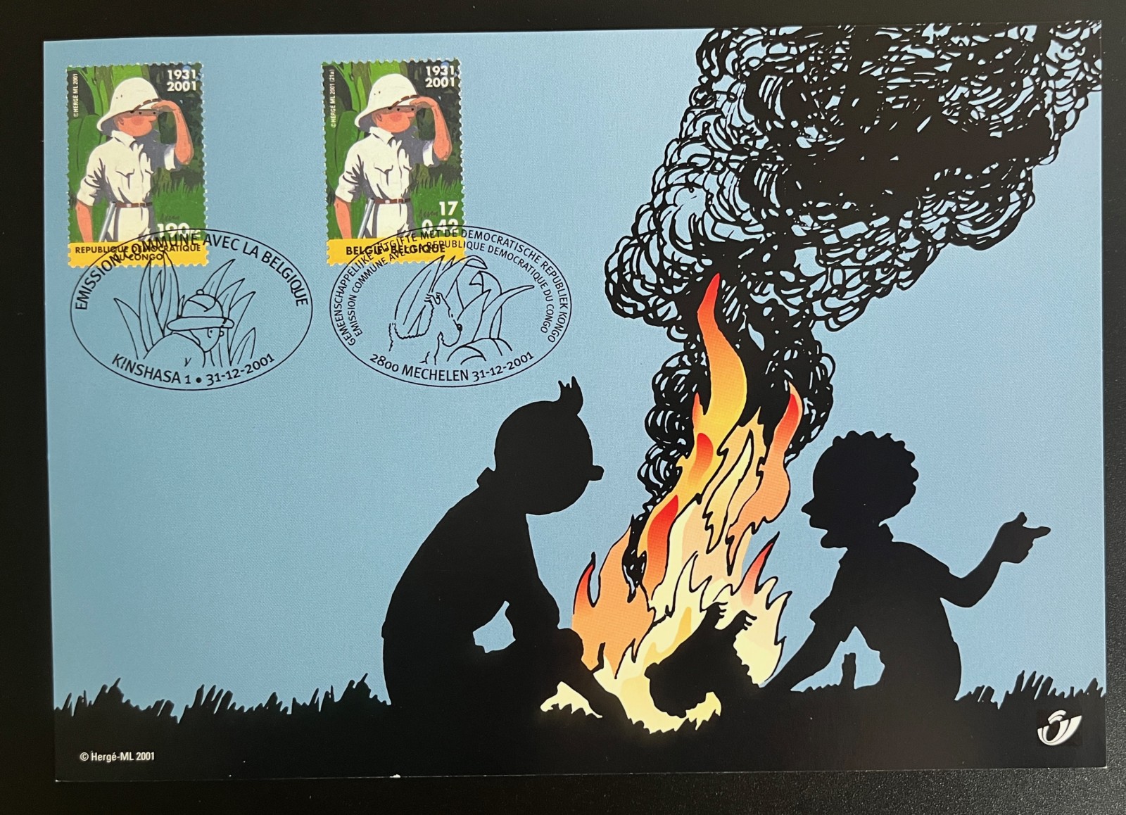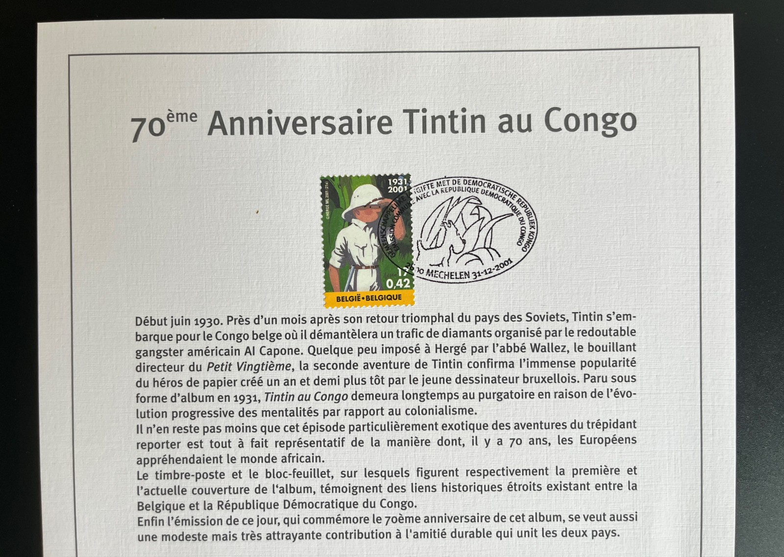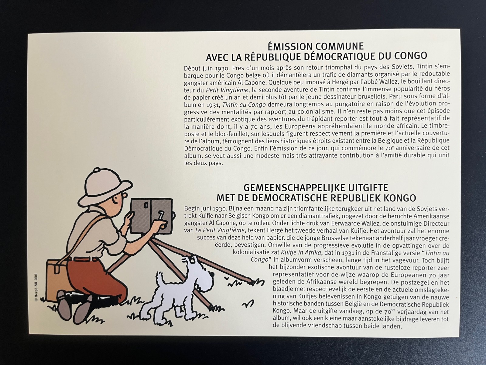 Hergé – 70ème anniversaire Tintin au Congo – Feuille d’art – Moulinsart – 2001
