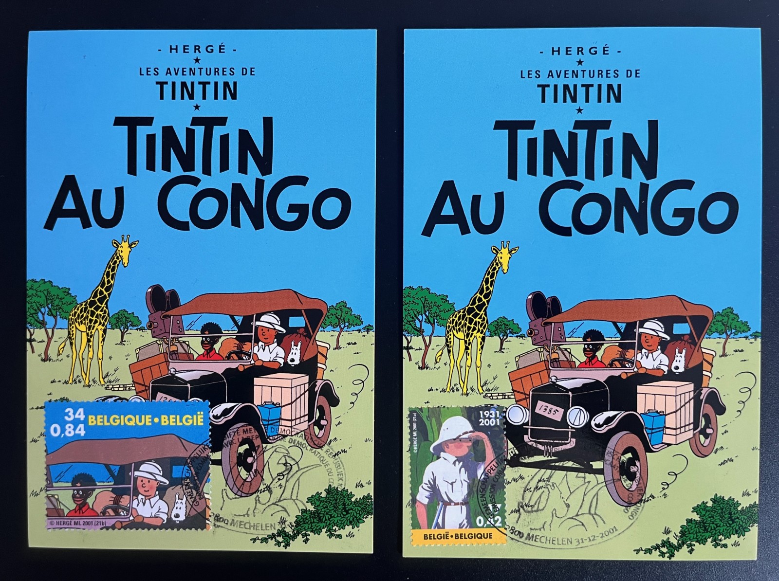 -Deux cartes postales Tintin au Congo avec timbres estampillés – Etat neuf