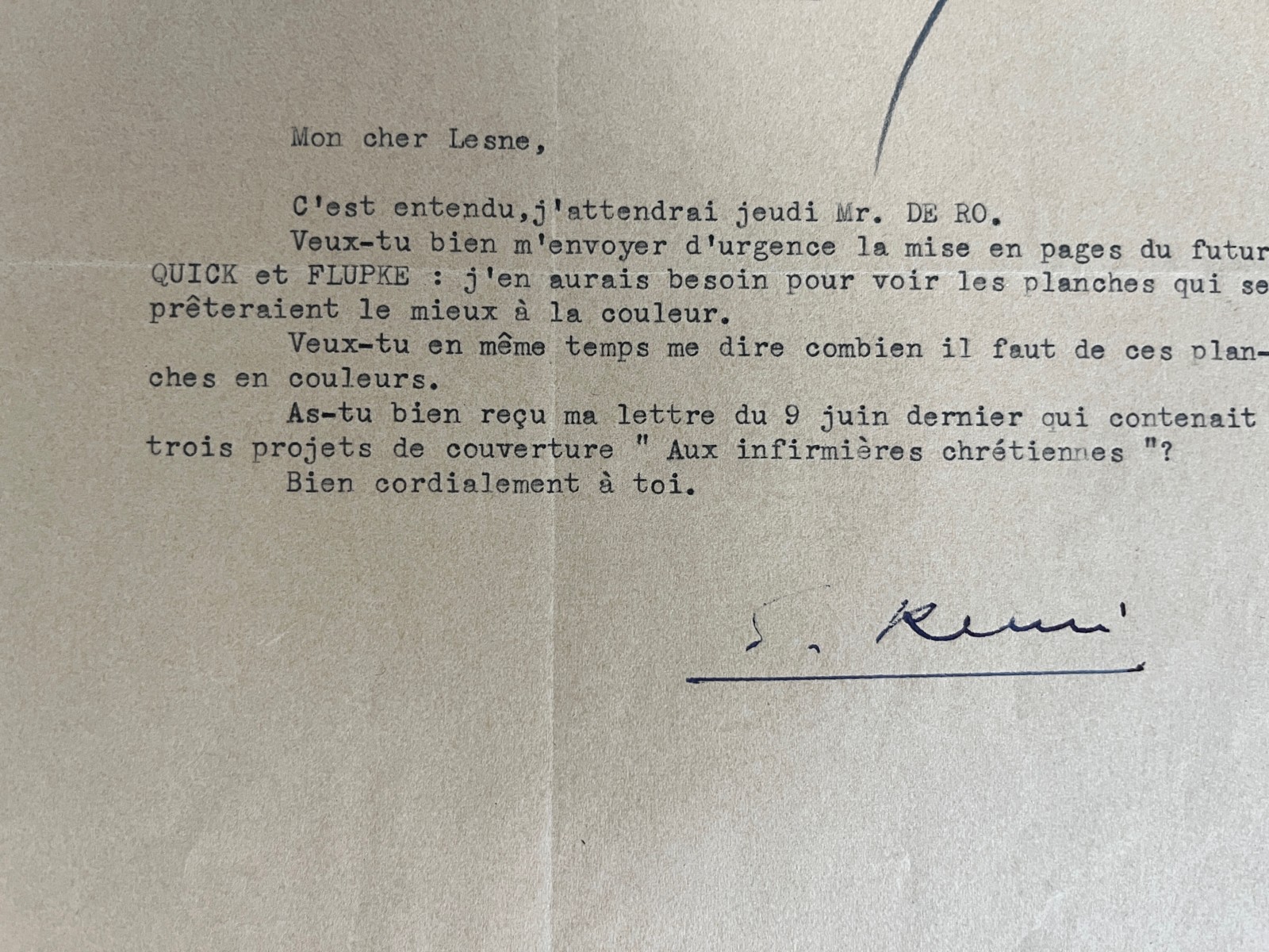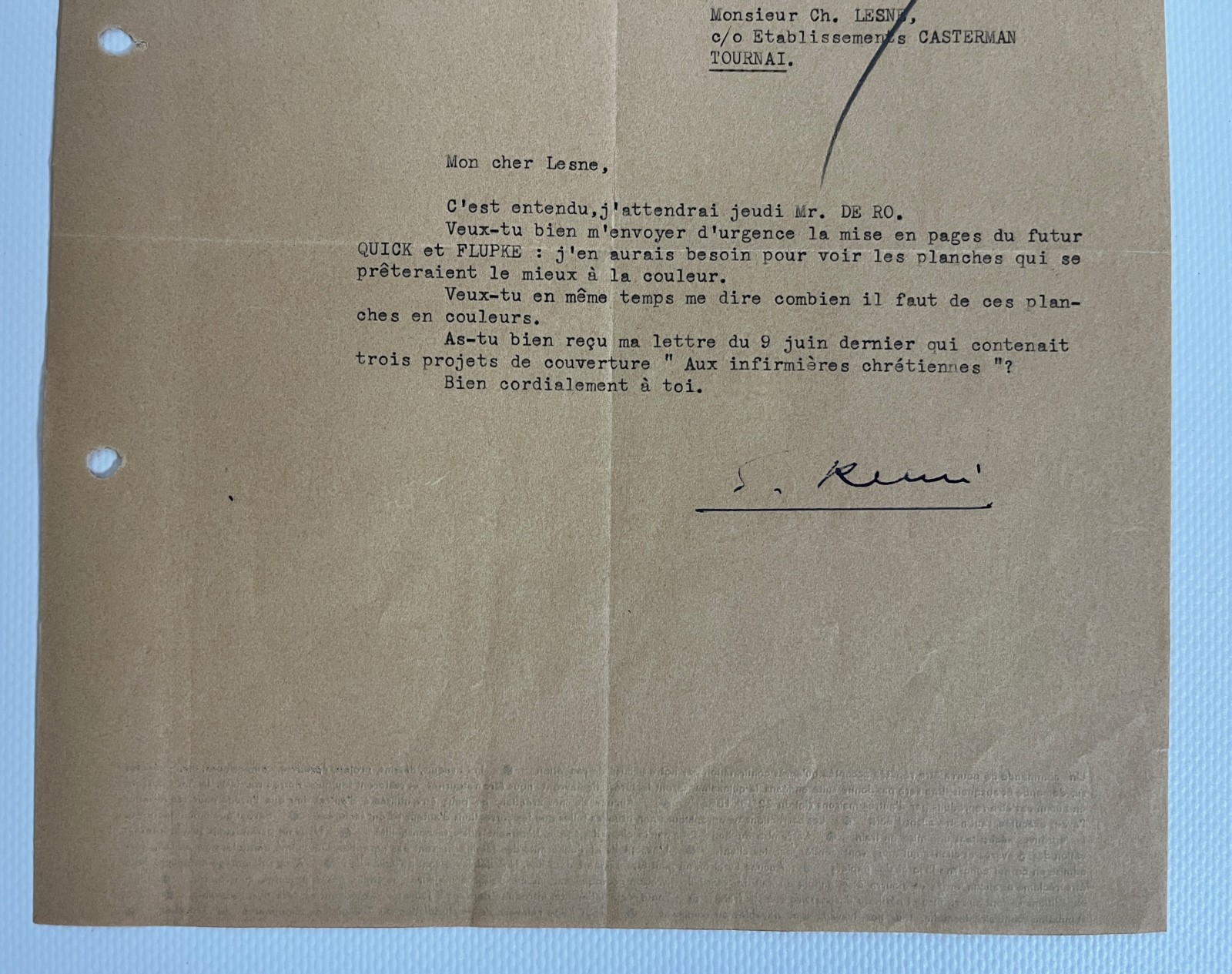 La lettre est adressée à Mr Charles Lesne, des établissements Casterman à Tournai – Prédécesseur de Louis Robert Casterman, ami et correspondant d’Hergé Aix établissements Casterman – Mr Lesne fut notamment impliqué dans les choix pour la parution de Tintin en Amérique