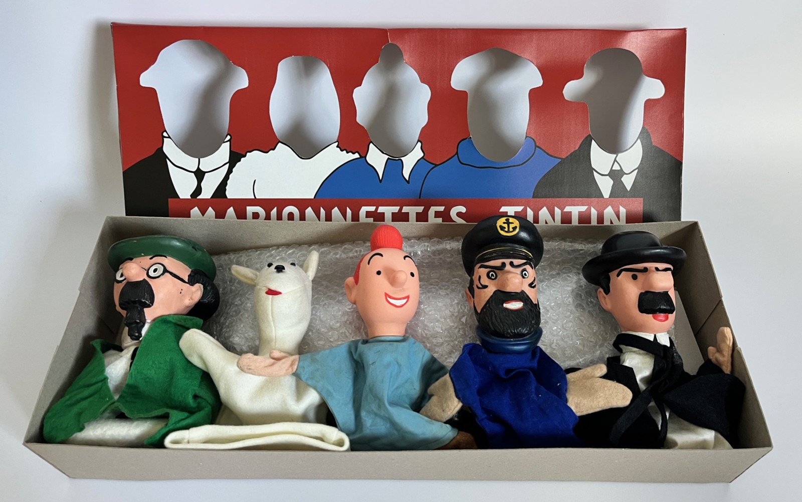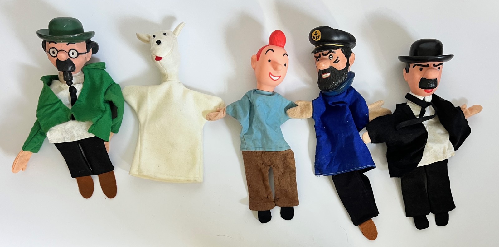 5 marionnettes en vinyle et tissus: Tintin, Milou, Haddock, Tournesol et Dupond