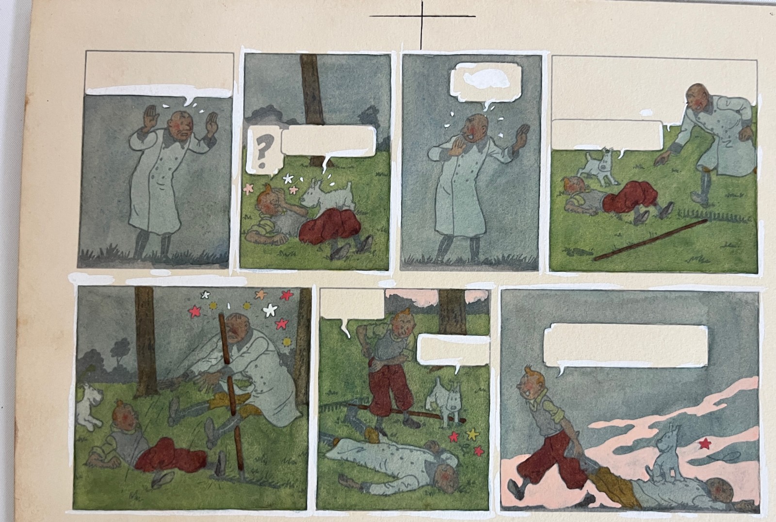 Un dernier mot sur ce bleu de coloriage de L’Ile Noire, dont les aquarelles ont gardé toute leur splendeur initiale : il s’agit d’une des toutes dernières doubles planches sur le marché, montrant Tintin écossais en action sur l’île. De plus, tous les bandits sont présents, de même que le gorille Ranko, le plus gentil des méchants. Passage mythique, grâce à l’intervention courageuse de Milou ! (©Marcel Wilmet)