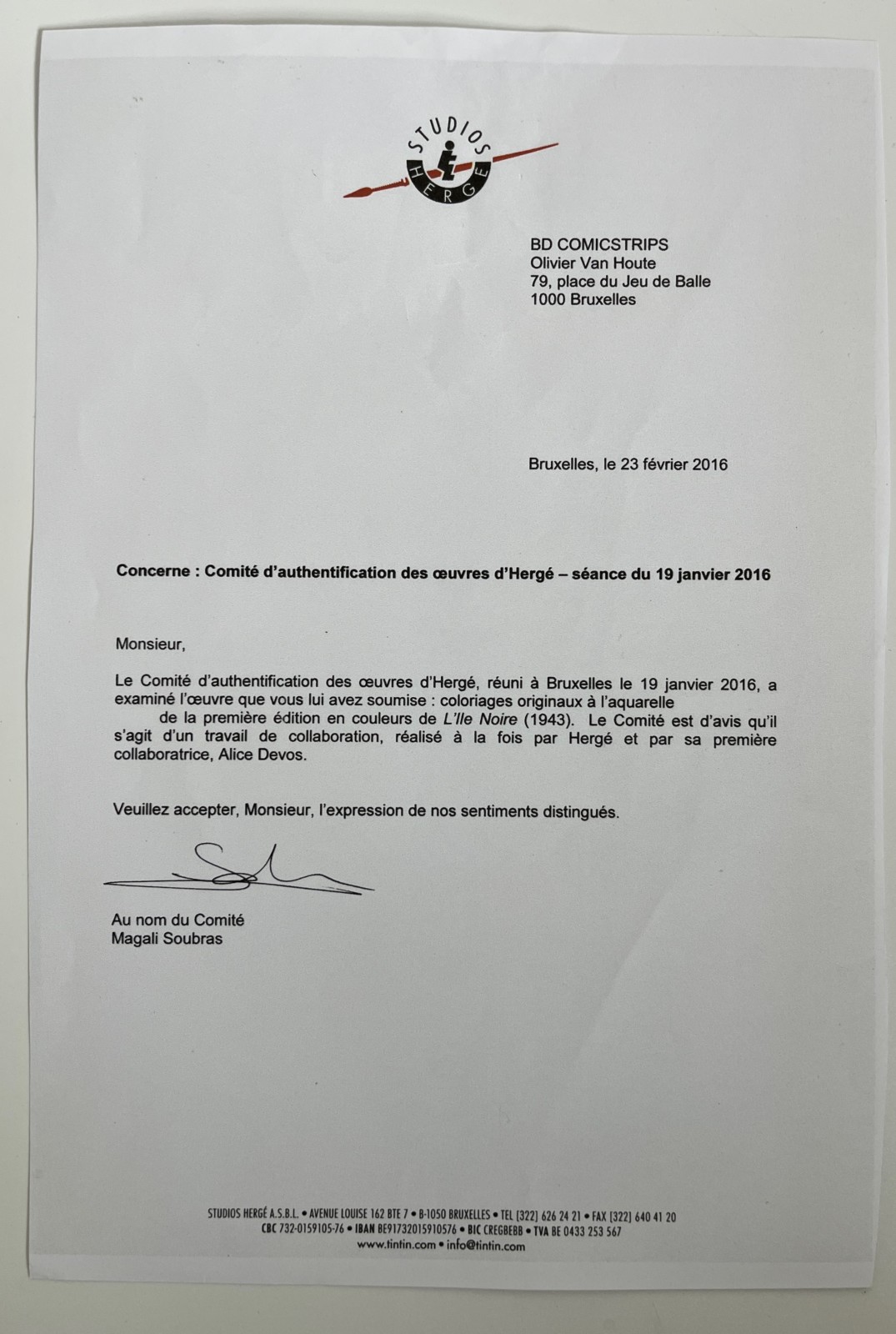Pas de doute que le dessinateur s’est engagé personnellement et à fond dans cette entreprise. Les coloriages originaux pour L’Ile Noire de 1943 ont d’ailleurs été certifiés en 2016 par le Comité d’Authentification Hergé, qui soulignait « qu’il s’agit d’un travail de collaboration, réalisé à la fois par Hergé et par sa première collaboratrice, Alice Devos ».