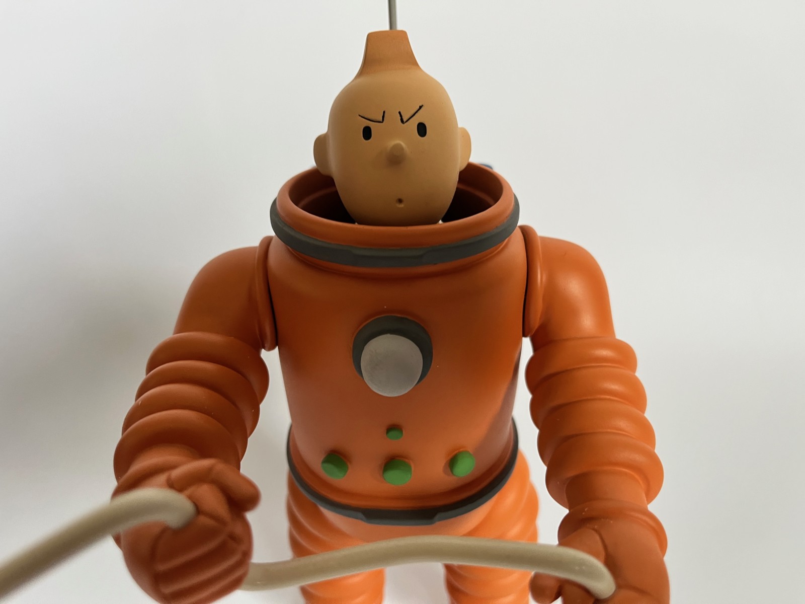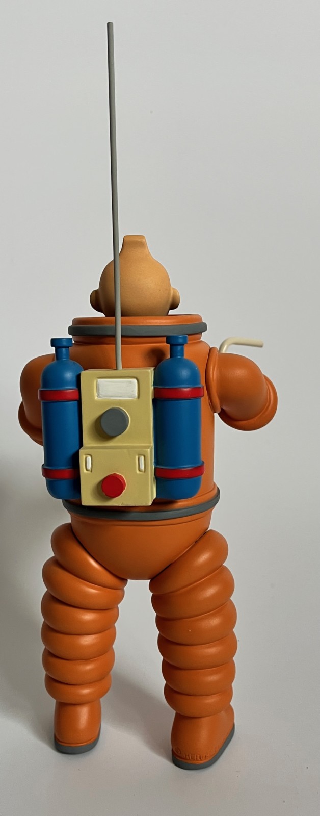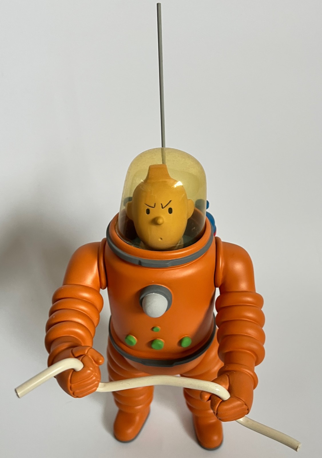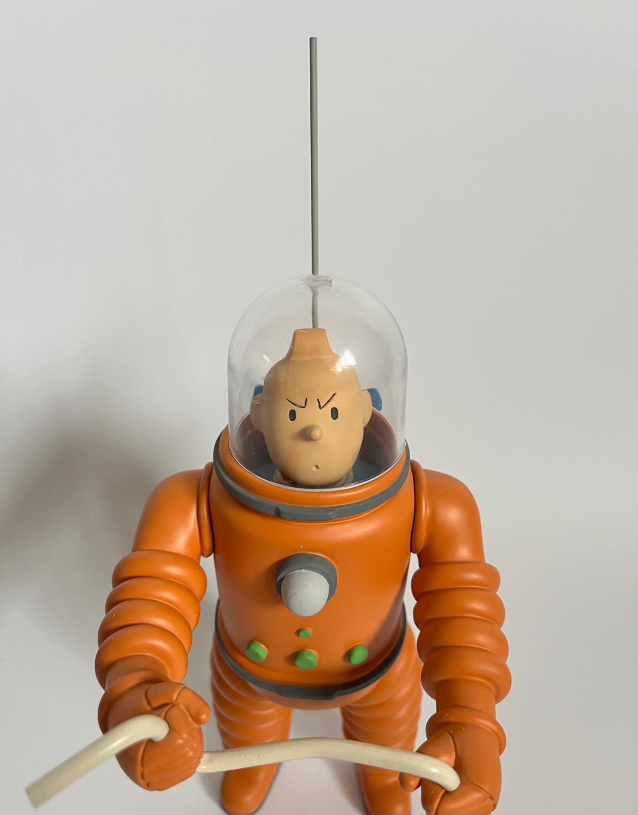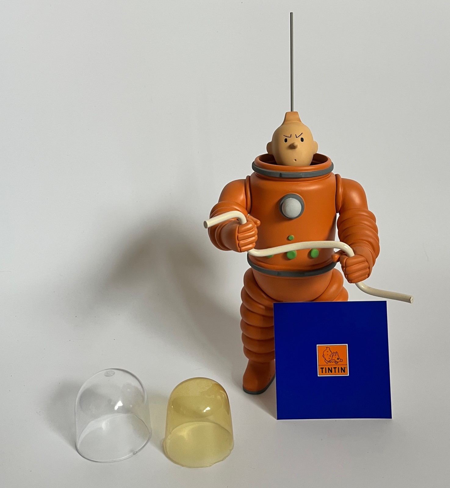 Résine polychrome et casque en plexiglas – Fourni avec deux casques: celui d’origine (jauni par le temps) et un second en plexiglas transparent – Hauteur: 25 cm (29 cm avec antenne) – Inspirée des Aventures de Tintin, On a marché sur la lune