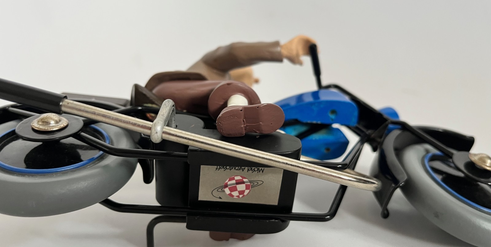 Inspiré des Aventures de Tintin, Le sceptre d’Ottokar – Tintin sur la moto, version moto bleue – 2e version Tintin mat – Tirage à environ 140 exemplaires – Pas de certificat d’authenticité (comme à l’époque mais autocollant Aroutcheff sous le véhicule)