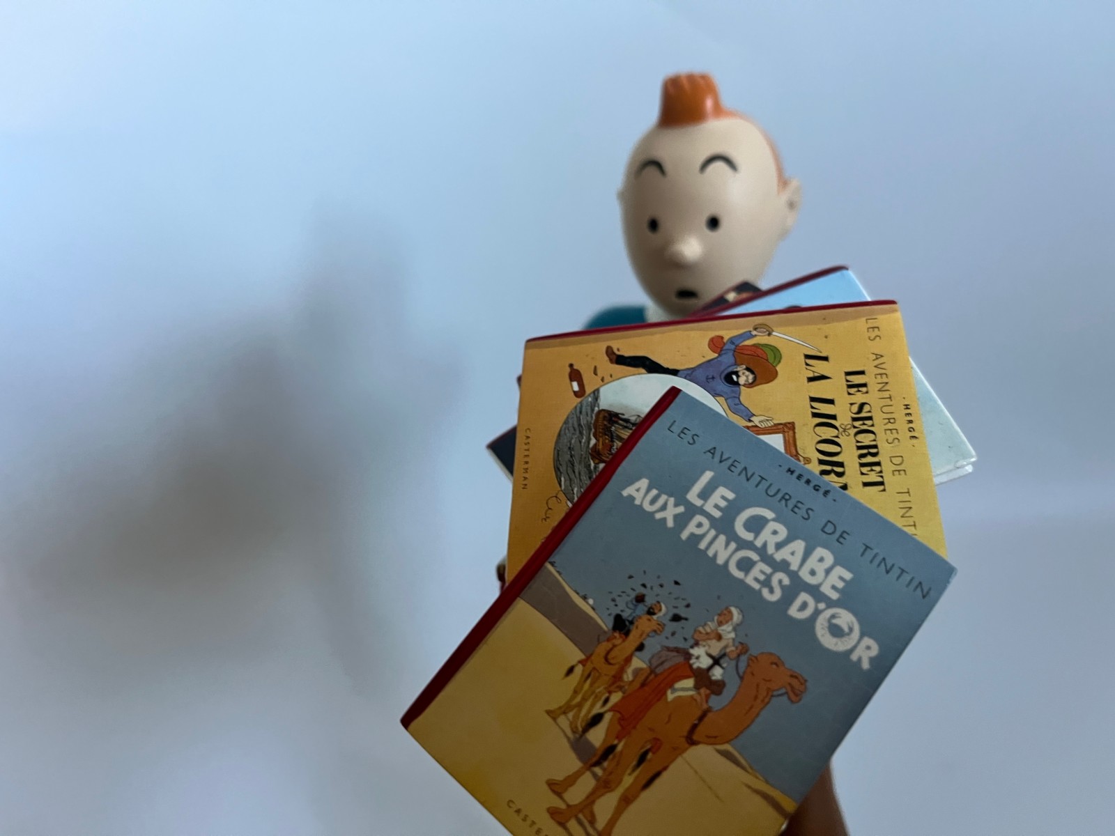 Figurine Tintin tenant les albums, la 1ère version (Le crabe aux pinces d’or et Le trésor de Rackham le Rouge) – Collection Images Mythiques – Figurine en résine polychrome