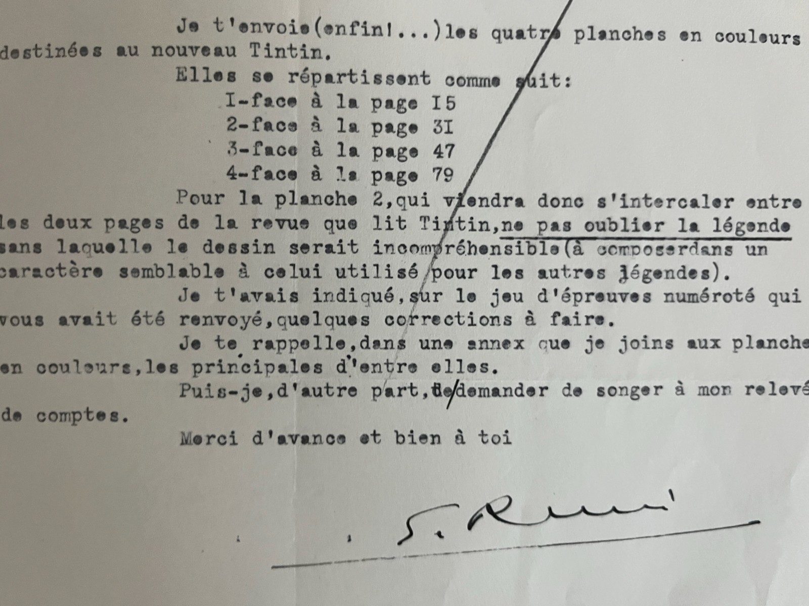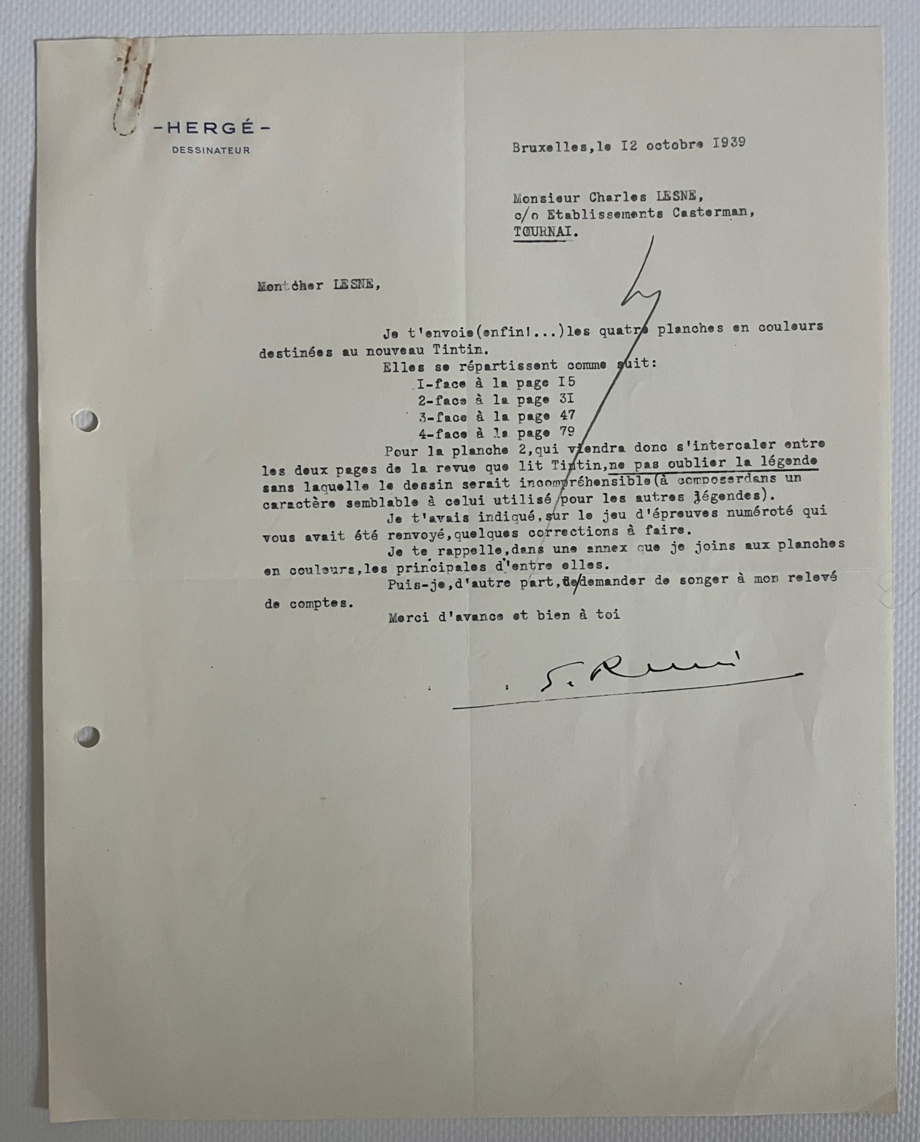 Datée du 12 octobre 1939 – Elle a pour sujet les planches originales et corrections à apporter à l’album Tintin en Syldavie (Le Sceptre d’Ottokar)