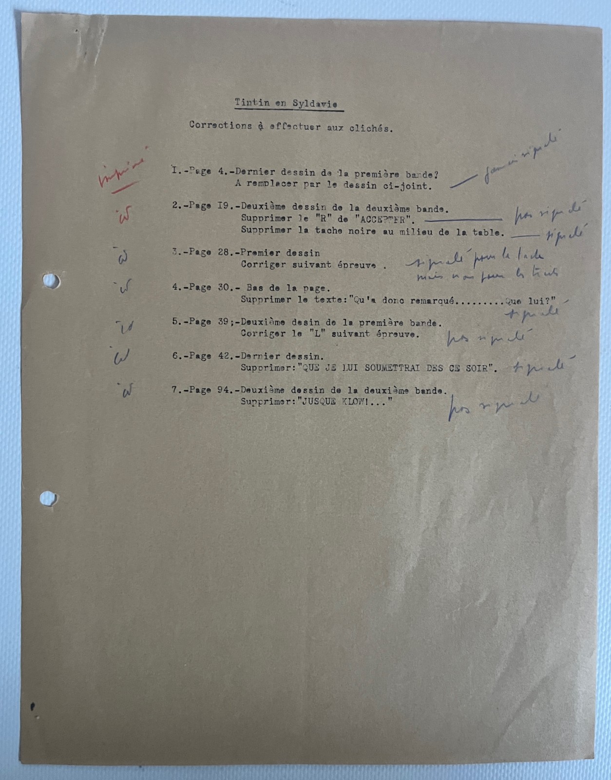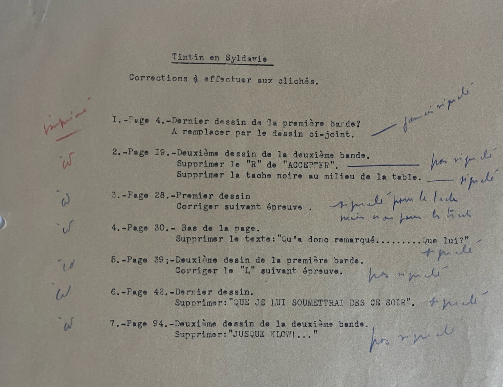 Lettre dactylographiée sur papier à en-tête Hergé dessinateur – Toutes les annotations sont d’époque – Signée par Hergé à l’encre noire + feuillet avec la liste des corrections à effectuer (l’écriture n’est pas de Hergé mais d’un collaborateur de Casterman)