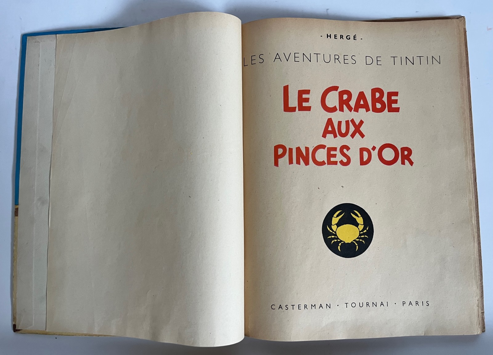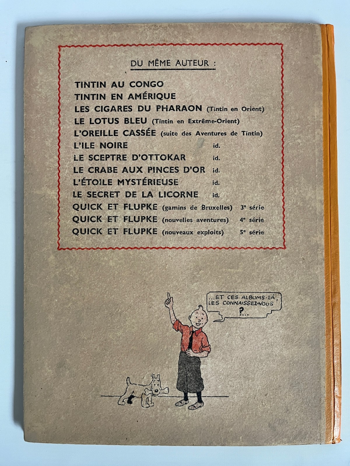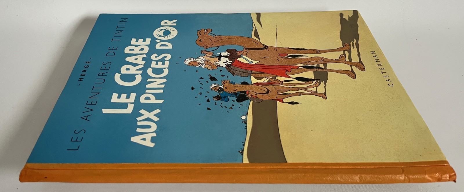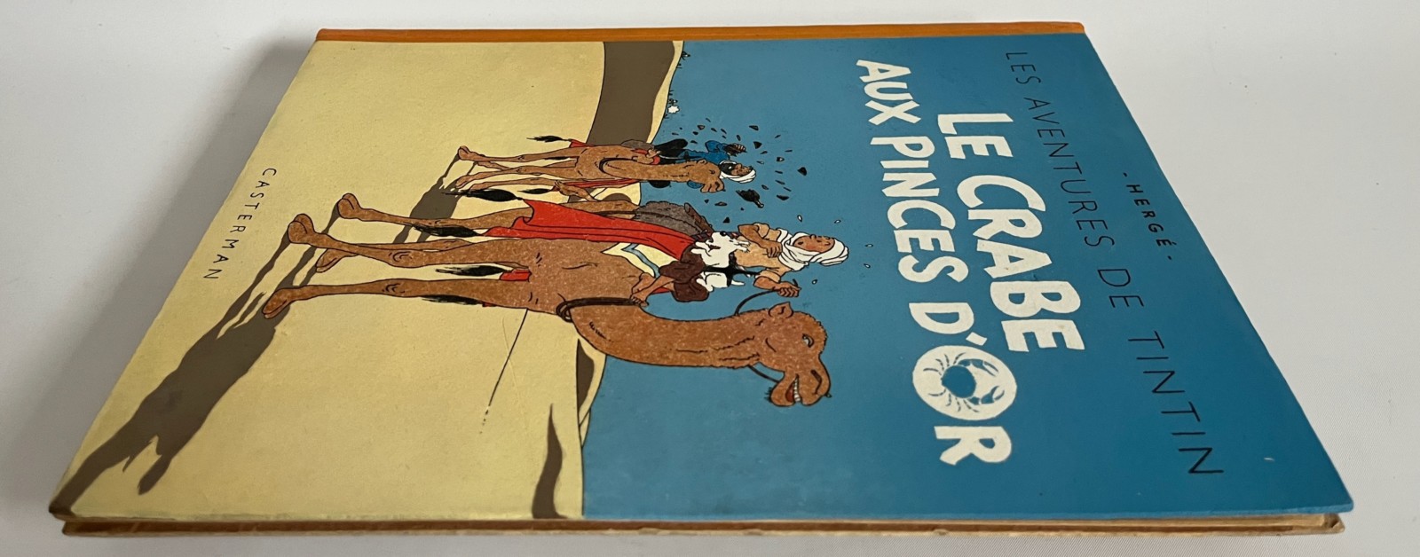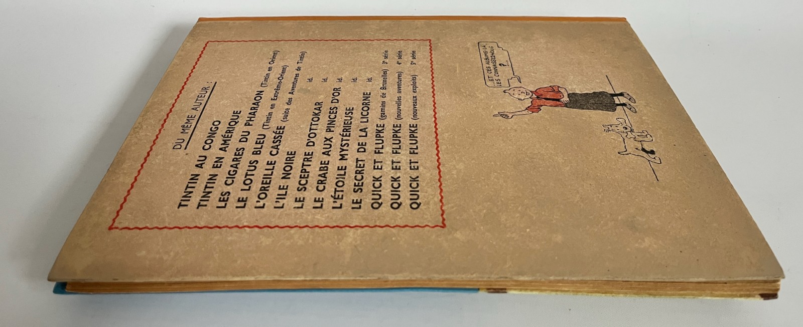 Album en TBE – Les plats ont été restaurés ainsi que le dos – Plats bien colorés – Coins à peine émoussés – Une griffe au 1er plat qui part de la patte droite du dromadaire de Tintin et un petit coup au niveau de la lettre ‘B’ de crabe dans le titre – Egalement trois marques au 2e plat près des titres ‘Ile Noire/Sceptre d’Ottokar/Crabe aux pinces d’or – Les coiffes ont été restaurées – Cahier intérieur homogène et solidaire – Pliures de lectures – Petites déchirures de lecture dans le bas des pages dont la plupart ont été restaurés avec soin – Pas d’écriture