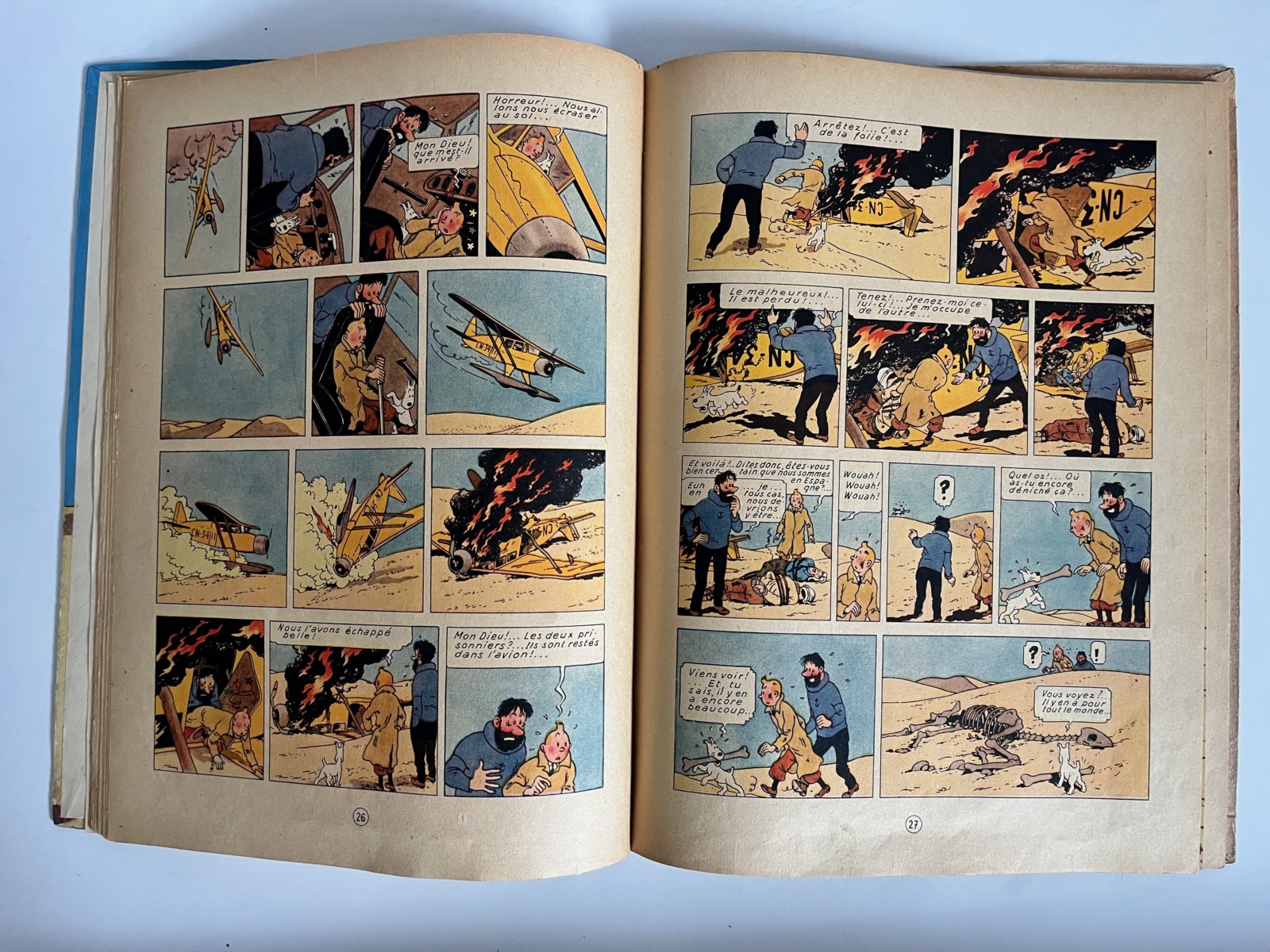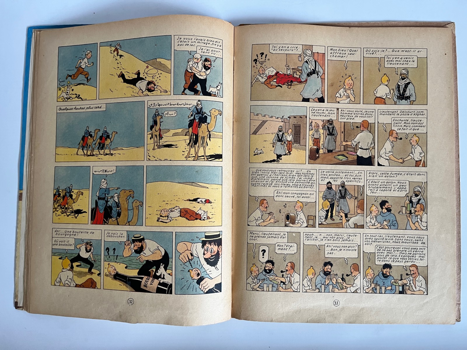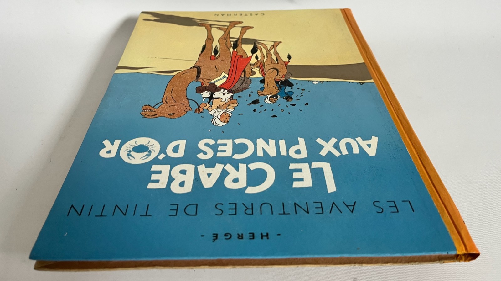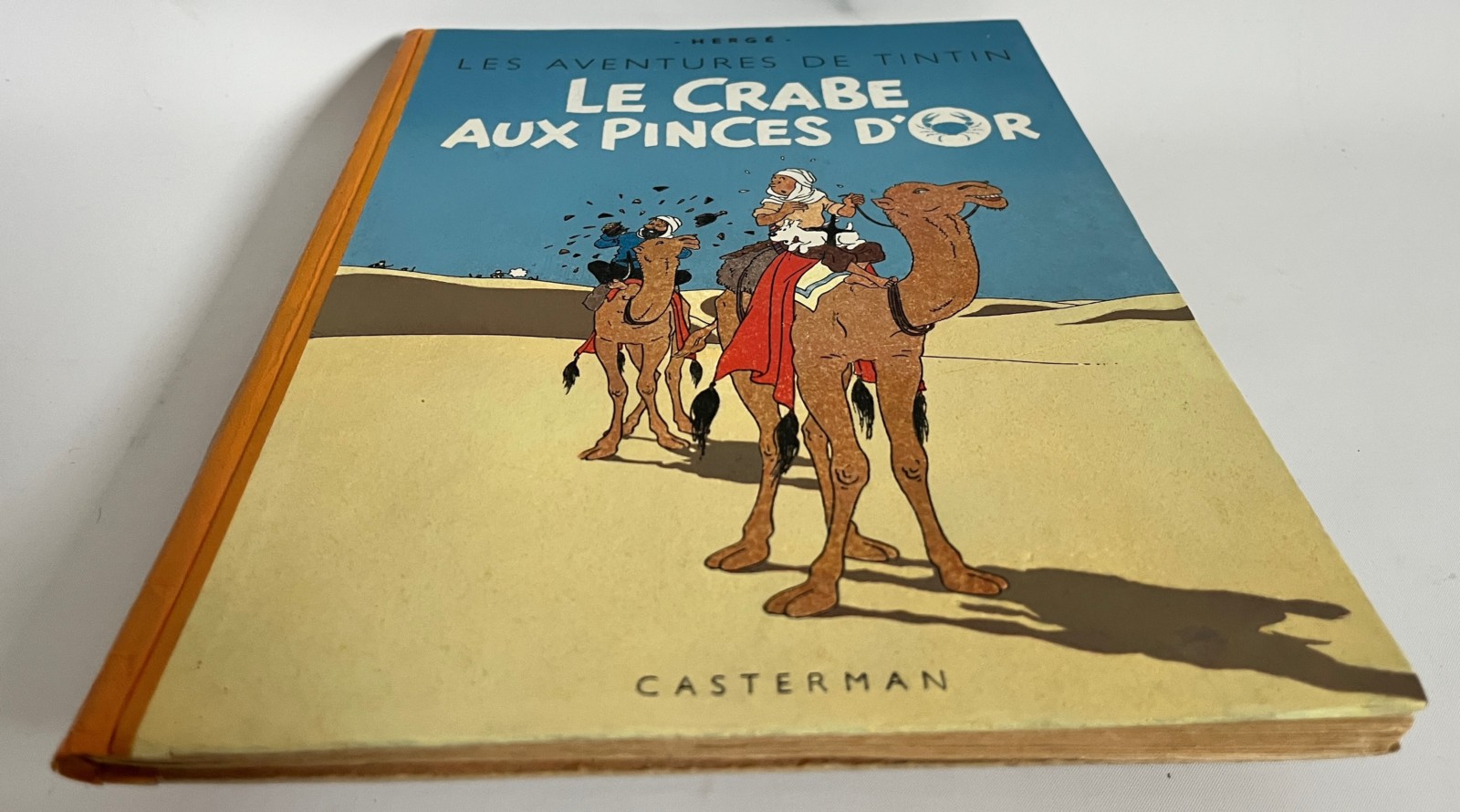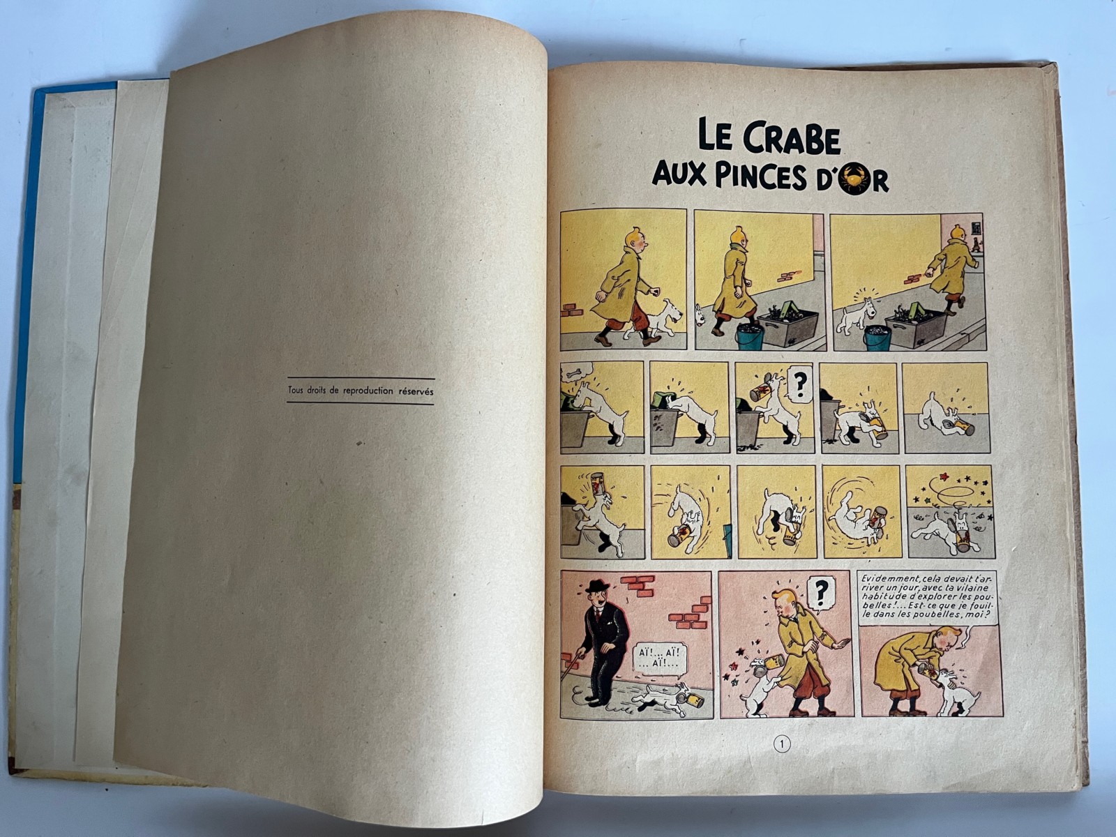 Album en TBE – Les plats ont été restaurés ainsi que le dos – Plats bien colorés – Coins à peine émoussés – Une griffe au 1er plat qui part de la patte droite du dromadaire de Tintin et un petit coup au niveau de la lettre ‘B’ de crabe dans le titre – Egalement trois marques au 2e plat près des titres ‘Ile Noire/Sceptre d’Ottokar/Crabe aux pinces d’or – Les coiffes ont été restaurées – Cahier intérieur homogène et solidaire – Pliures de lectures – Petites déchirures de lecture dans le bas des pages dont la plupart ont été restaurés avec soin – Pas d’écriture
