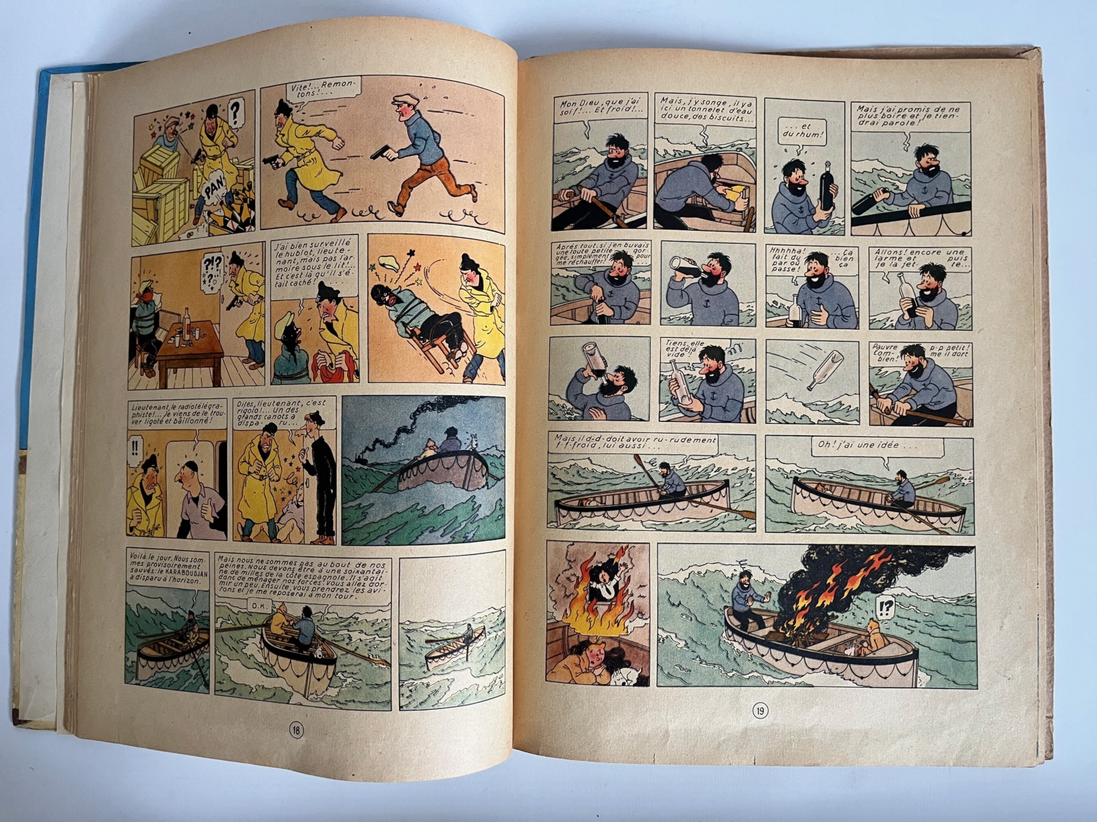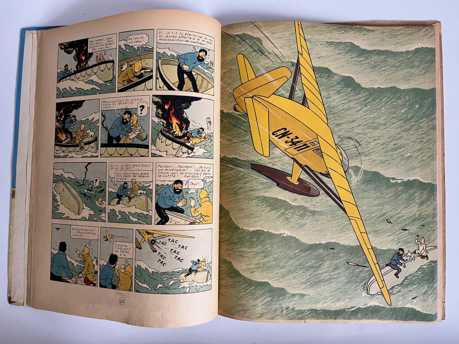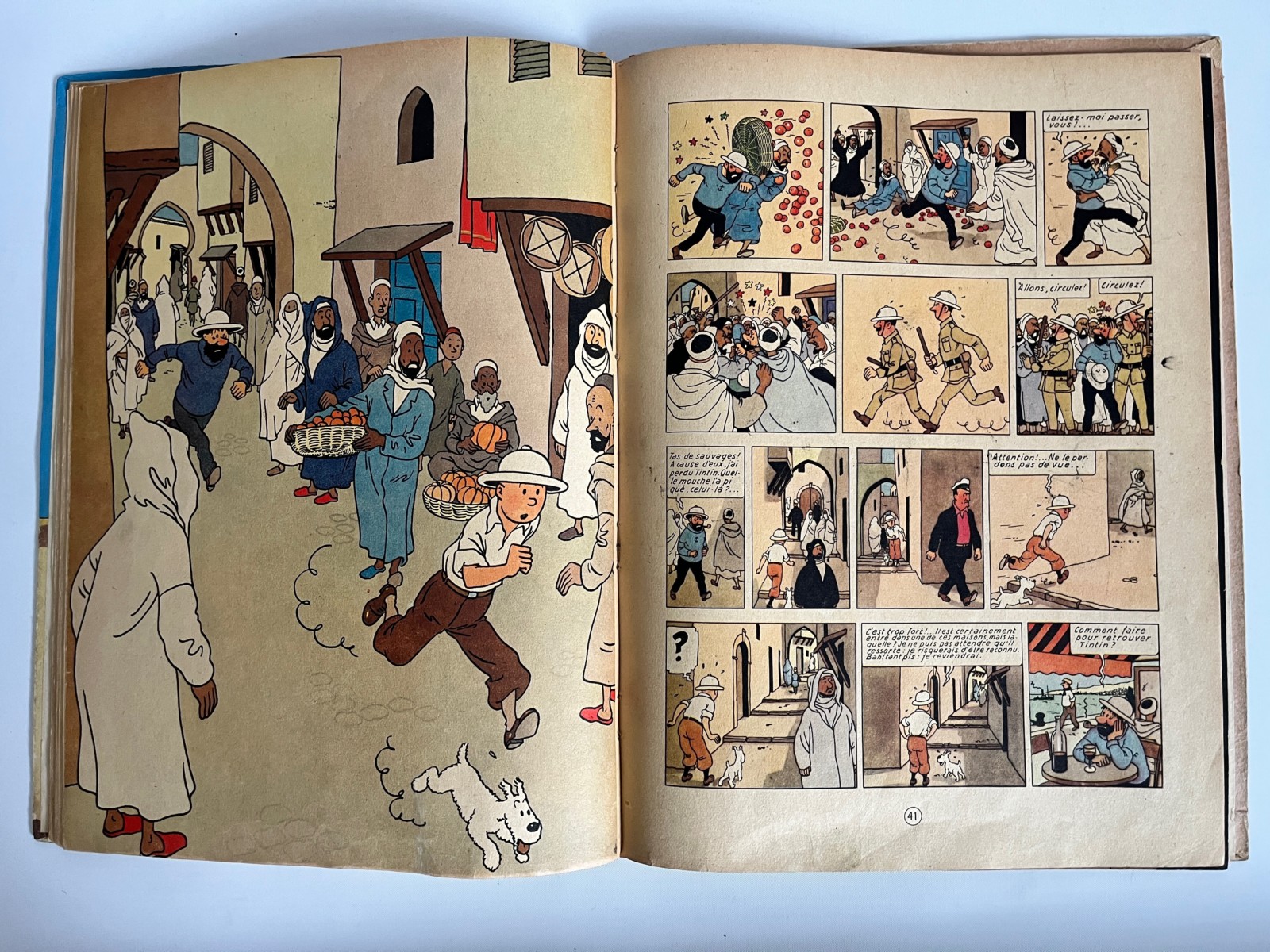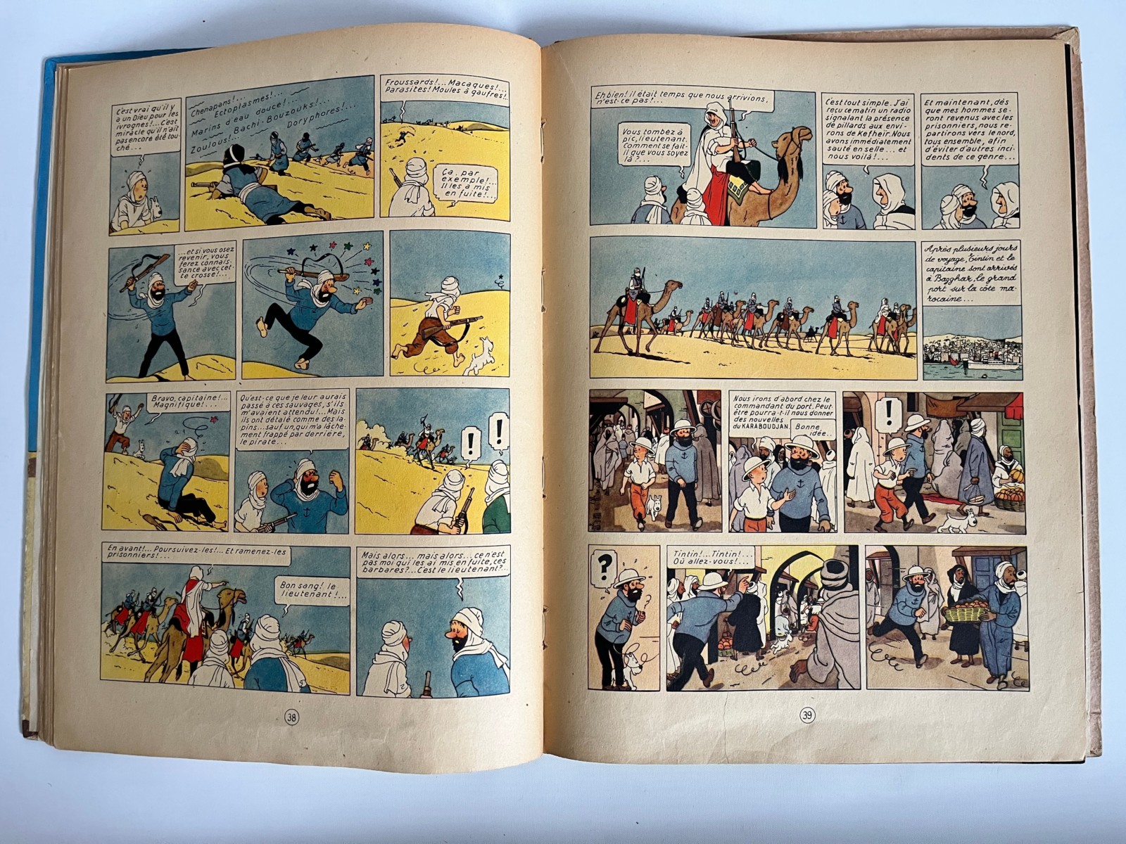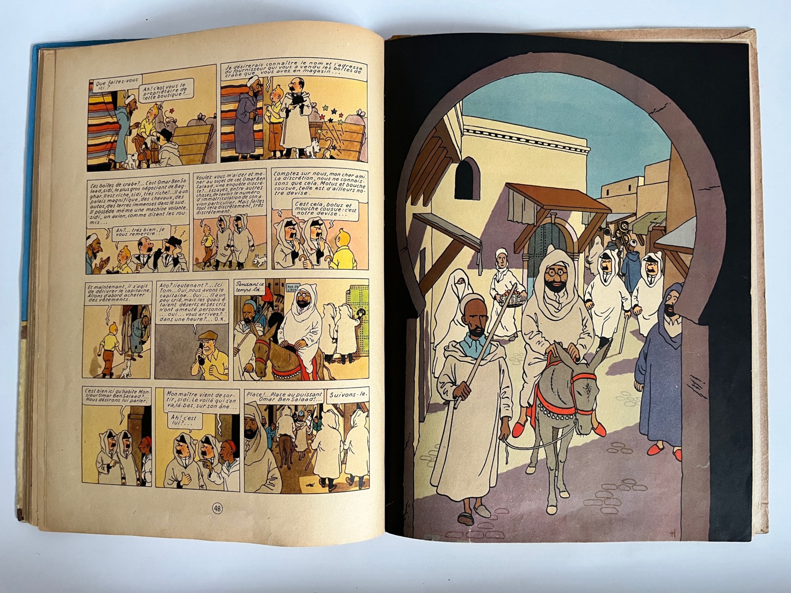 Album en TBE – Les plats ont été restaurés ainsi que le dos – Plats bien colorés – Coins à peine émoussés – Une griffe au 1er plat qui part de la patte droite du dromadaire de Tintin et un petit coup au niveau de la lettre ‘B’ de crabe dans le titre – Egalement trois marques au 2e plat près des titres ‘Ile Noire/Sceptre d’Ottokar/Crabe aux pinces d’or – Les coiffes ont été restaurées – Cahier intérieur homogène et solidaire – Pliures de lectures – Petites déchirures de lecture dans le bas des pages dont la plupart ont été restaurés avec soin – Pas d’écriture