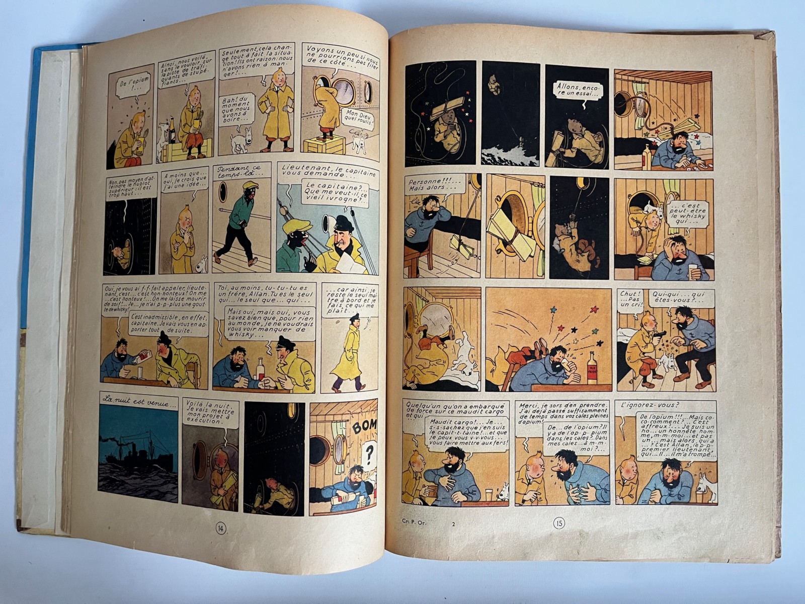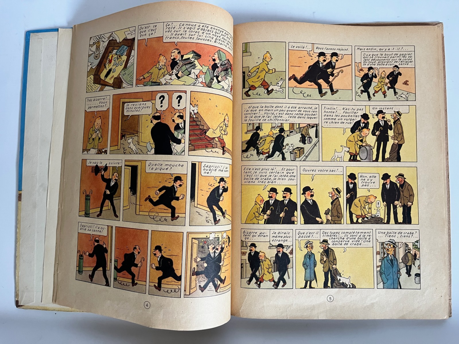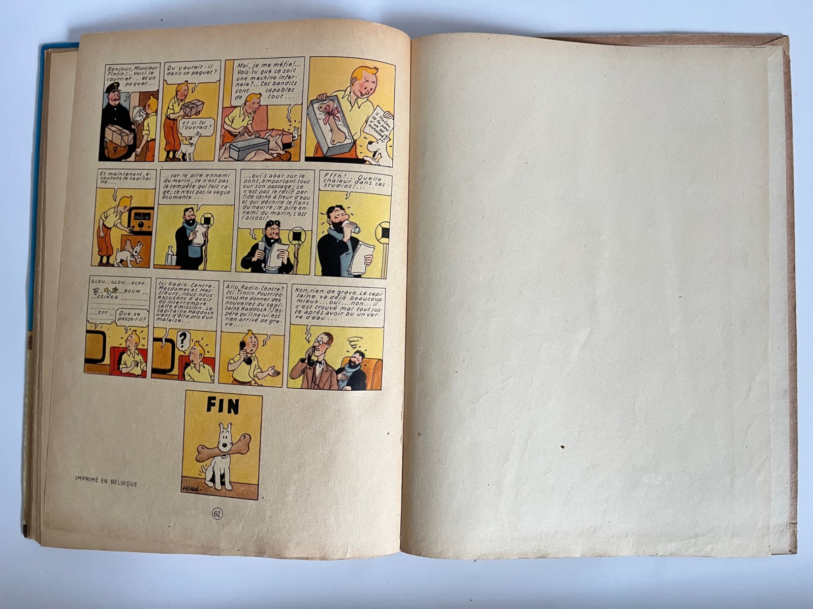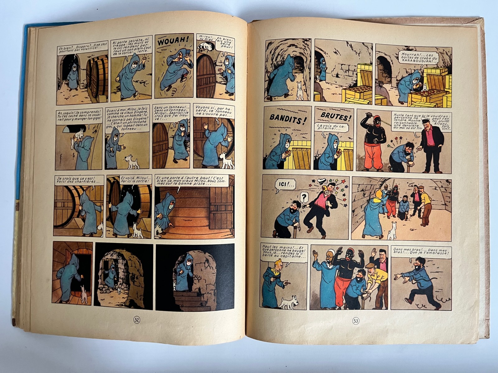 Album en TBE – Les plats ont été restaurés ainsi que le dos – Plats bien colorés – Coins à peine émoussés – Une griffe au 1er plat qui part de la patte droite du dromadaire de Tintin et un petit coup au niveau de la lettre ‘B’ de crabe dans le titre – Egalement trois marques au 2e plat près des titres ‘Ile Noire/Sceptre d’Ottokar/Crabe aux pinces d’or – Les coiffes ont été restaurées – Cahier intérieur homogène et solidaire – Pliures de lectures – Petites déchirures de lecture dans le bas des pages dont la plupart ont été restaurés avec soin – Pas d’écriture