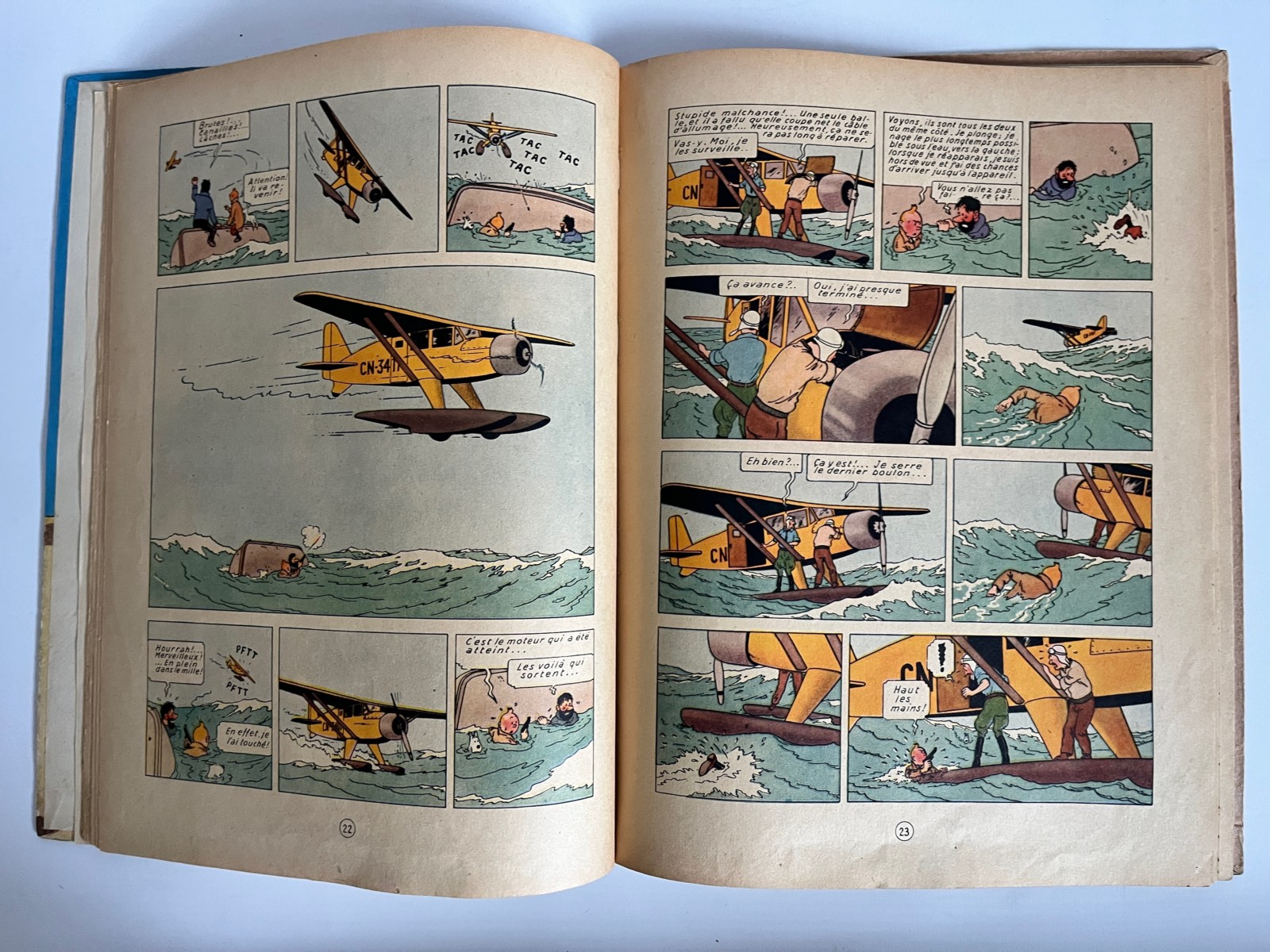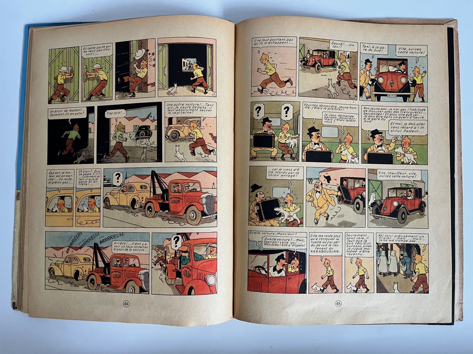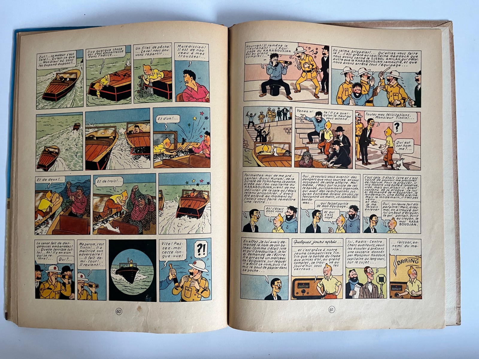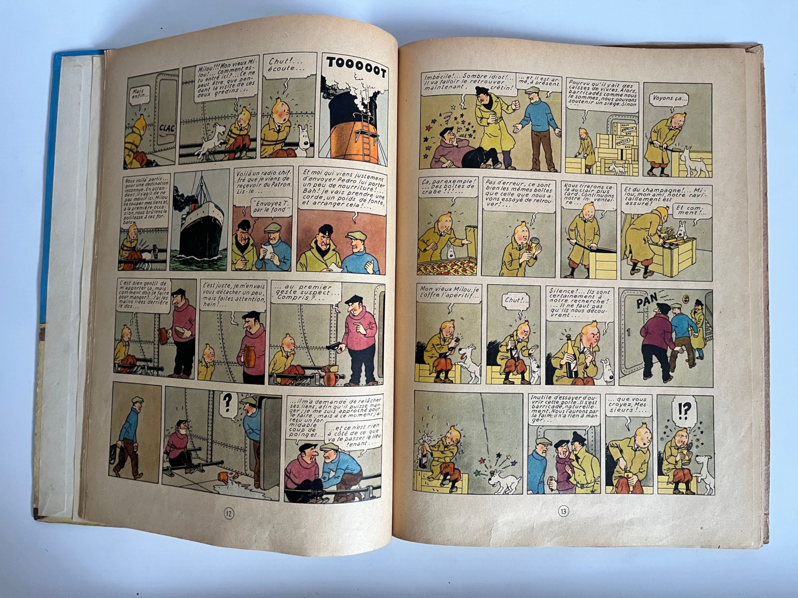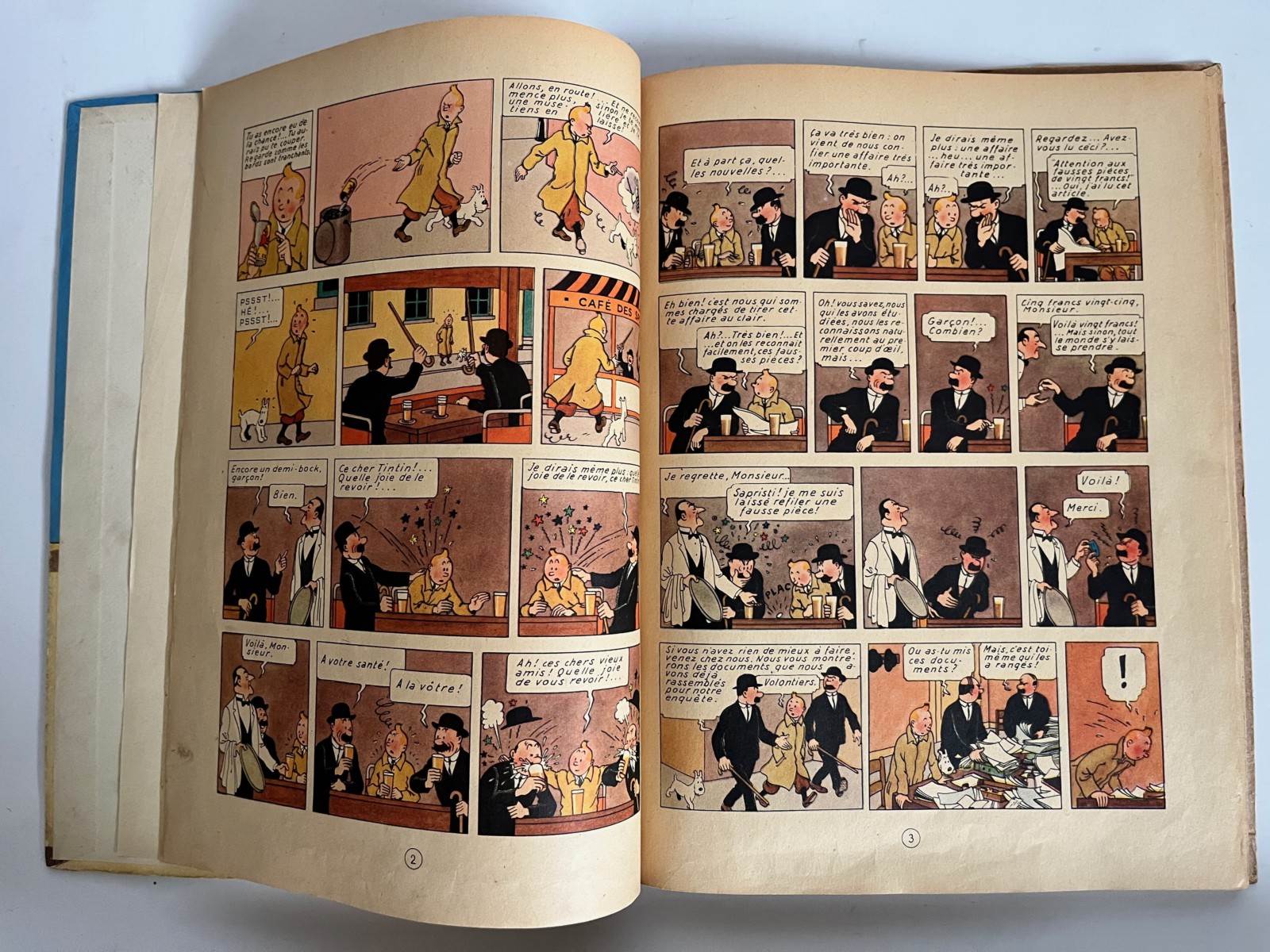 Album en TBE – Les plats ont été restaurés ainsi que le dos – Plats bien colorés – Coins à peine émoussés – Une griffe au 1er plat qui part de la patte droite du dromadaire de Tintin et un petit coup au niveau de la lettre ‘B’ de crabe dans le titre – Egalement trois marques au 2e plat près des titres ‘Ile Noire/Sceptre d’Ottokar/Crabe aux pinces d’or – Les coiffes ont été restaurées – Cahier intérieur homogène et solidaire – Pliures de lectures – Petites déchirures de lecture dans le bas des pages dont la plupart ont été restaurés avec soin – Pas d’écriture