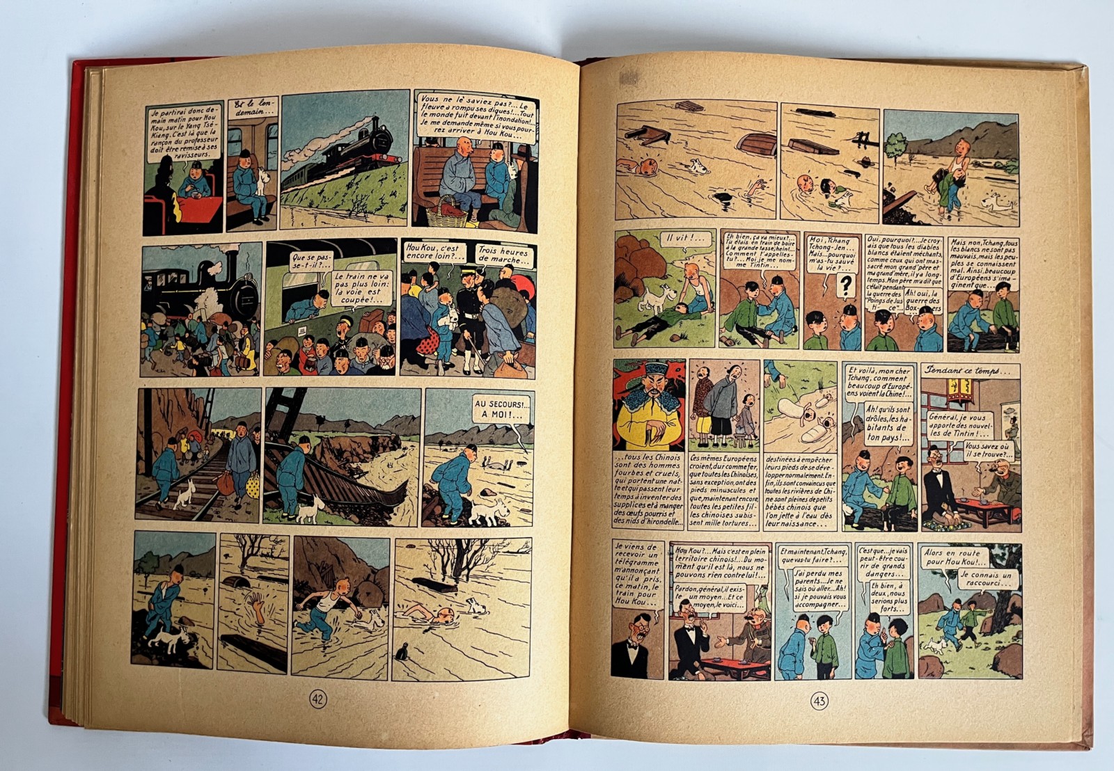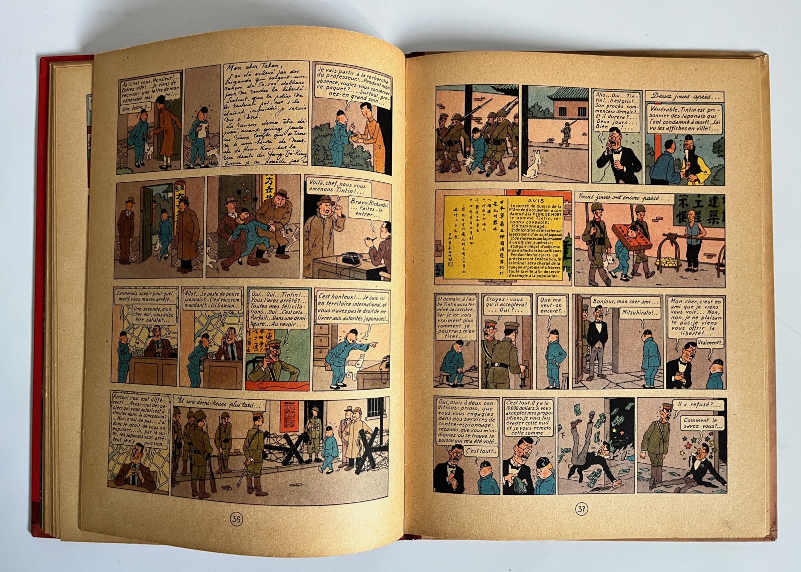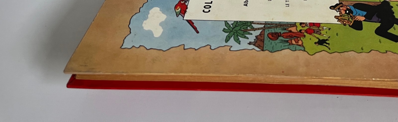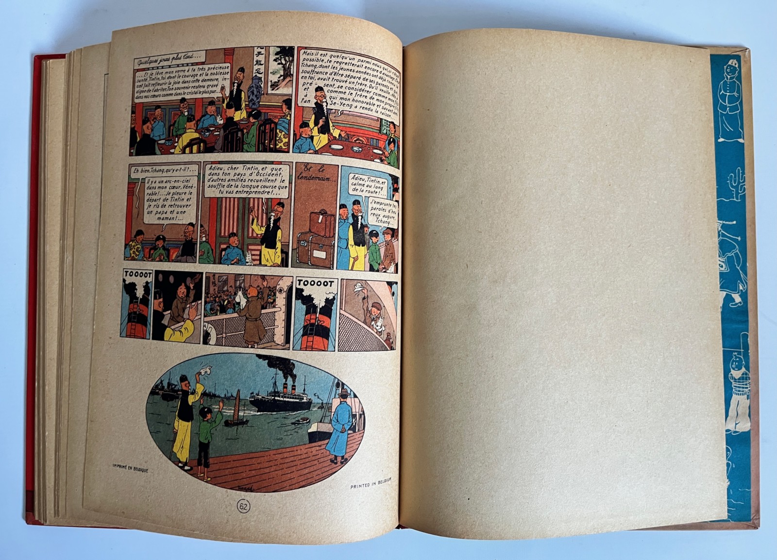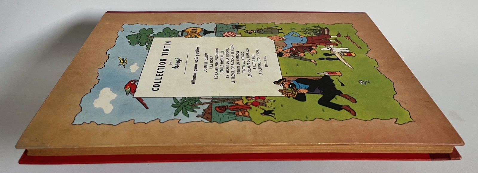 Edition originale couleurs – 2e plat B1 – Pull du Capitaine en 2 couleurs – Dos rouge – Texte en bleu en page de titre – Impression sur gros papier jauni