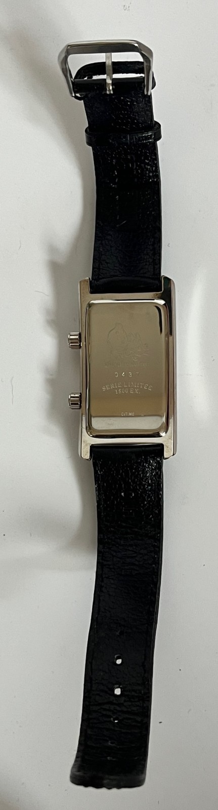 Tirage limité numéroté /1500 exemplaires – Bracelet en cuir noir – Deux cadrans – Etat de fonctionnement non vérifié, la pile doit être changée