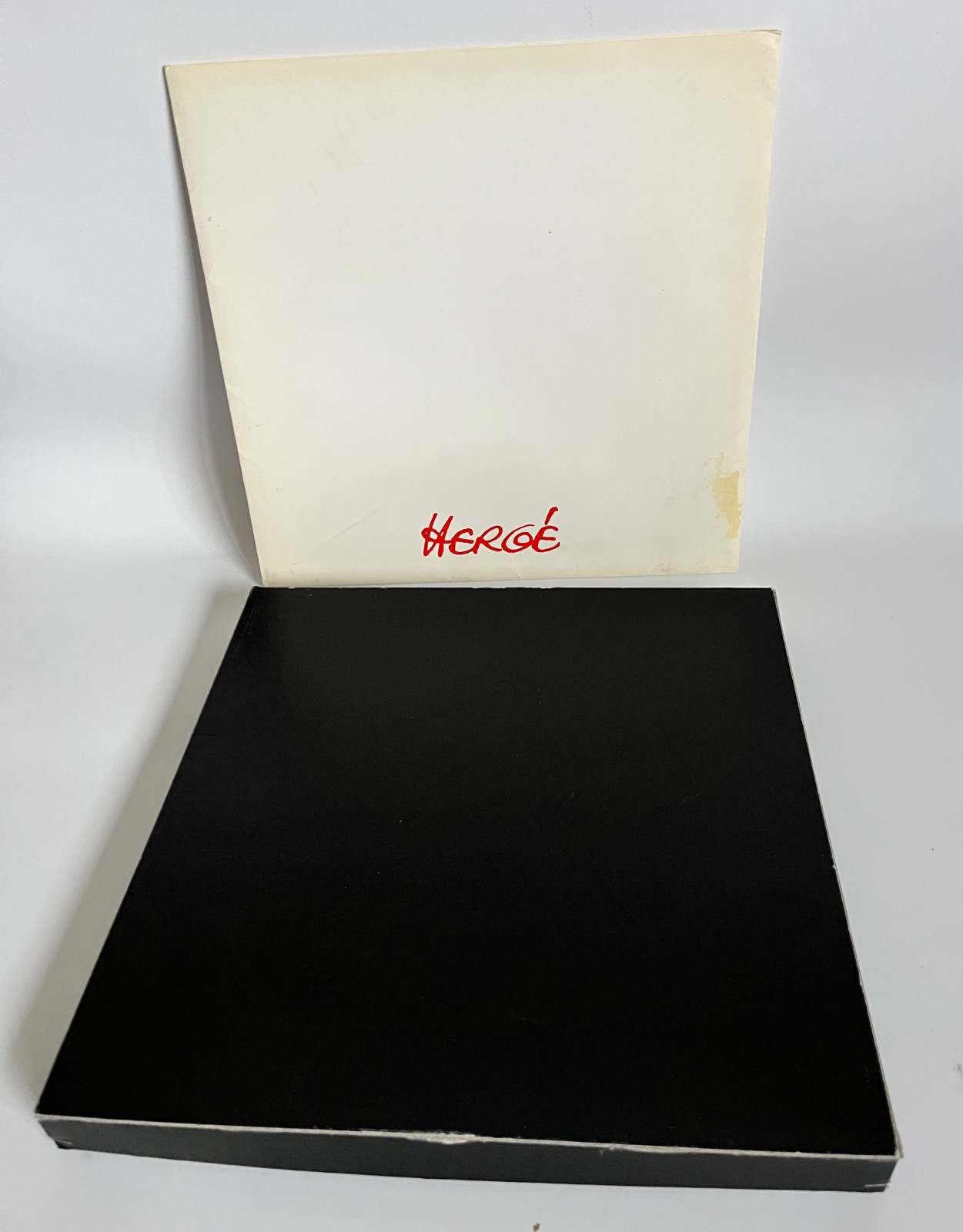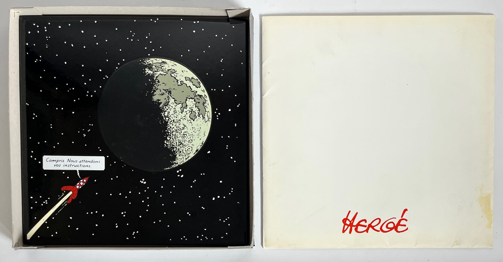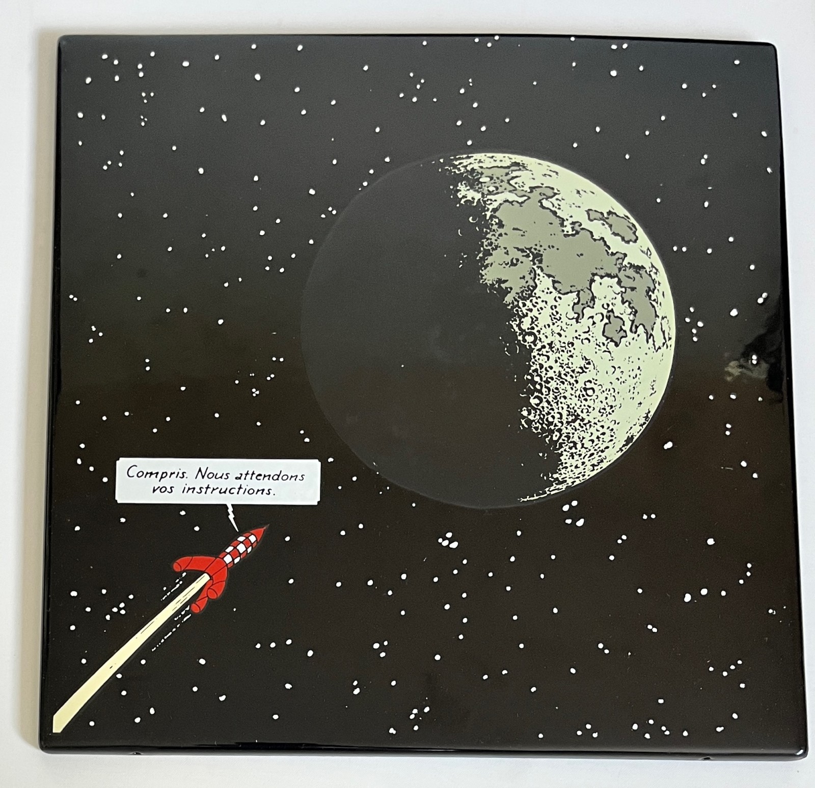 Hergé – Plaque émaillée On a marché sur la lune – Attendons instructions – Avec portfolio – 29X29 – Emaillerie Belge – 1985
