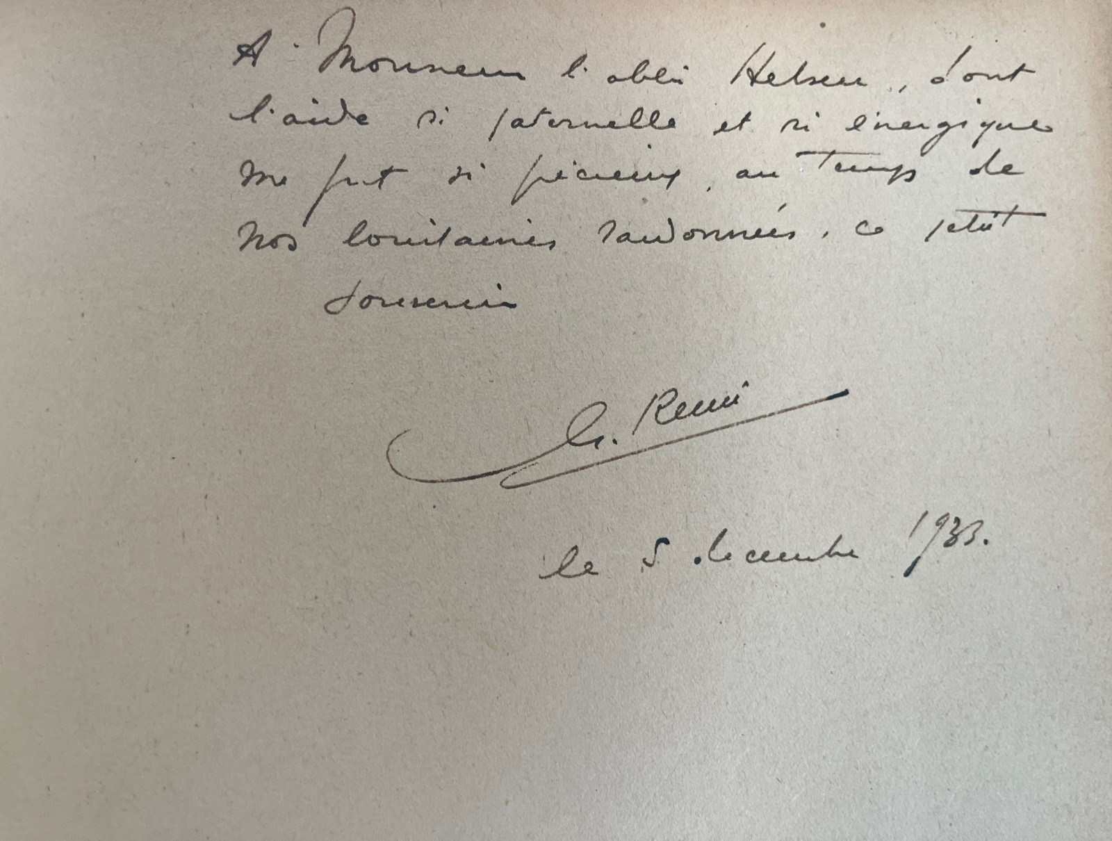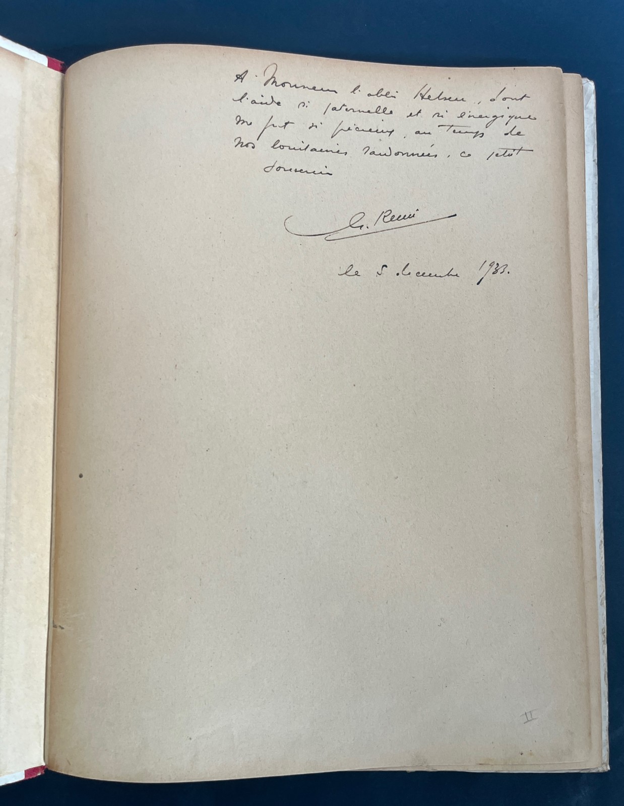 Dédicace manuscrite personnelle de Hergé sur le haut de la 2e page de garde – Encre noire – Le texte mentionne: ‘A monsieur l’abbé Helsen, dont l’aide si paternelle et si énergique me fut si précieux au temps de nos lointaines randonnées, ce petit souvenir’ – La Signature est de Georges Remi et datée du 5 décembre 1933