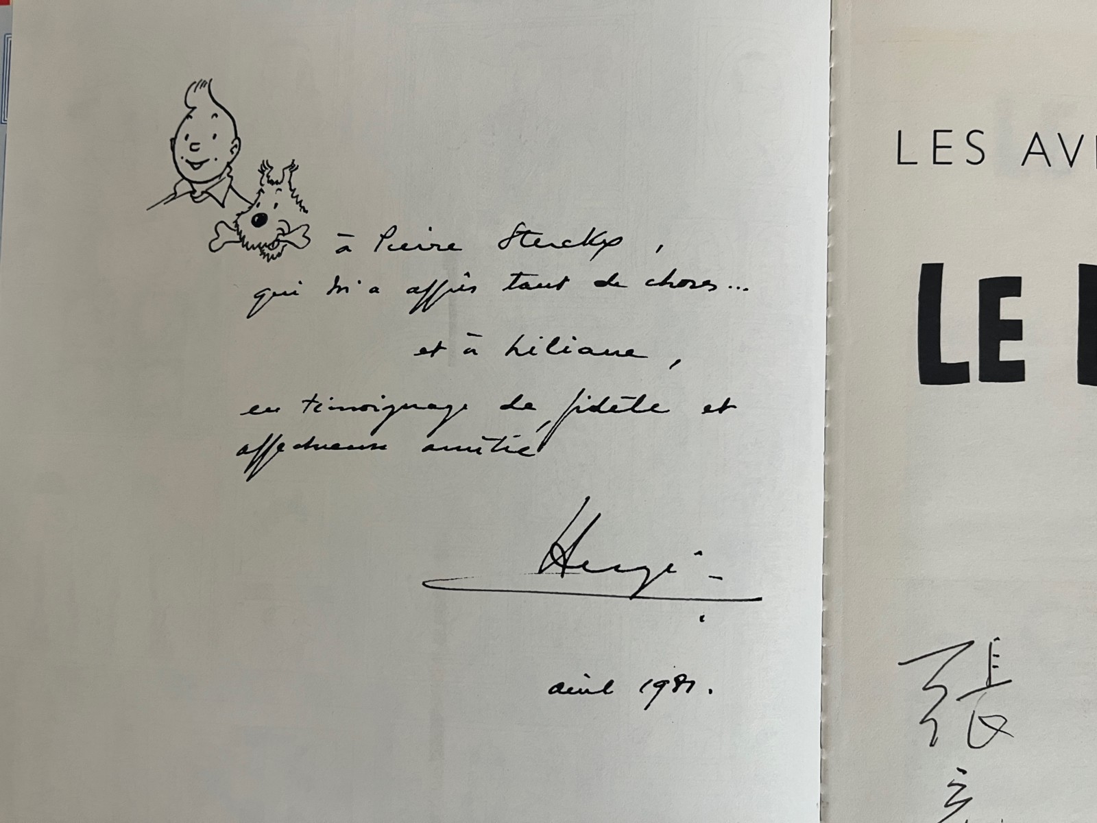 la dédicace comporte Tintin et Milou et est adressée à Pierre Sterckx avec ces mots ‘A Pierre Streckx qui m’a appris tant de choses…et à Liliane en témoignage de fidèle et affectueuse amitié’ – Elle est datée d’avril 1981