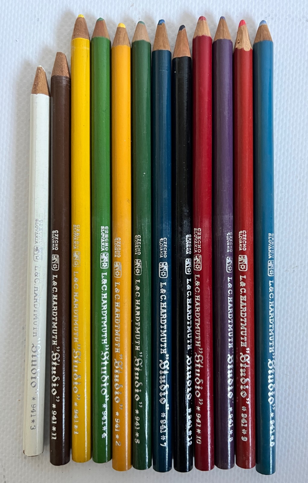 Version Tintin en Amérique, avec ses 12 crayons d’origine – Les logos portent tous le logo Hardtmuth – Ils ont été utilisés donc de taille différente, mais tous sont d’origine