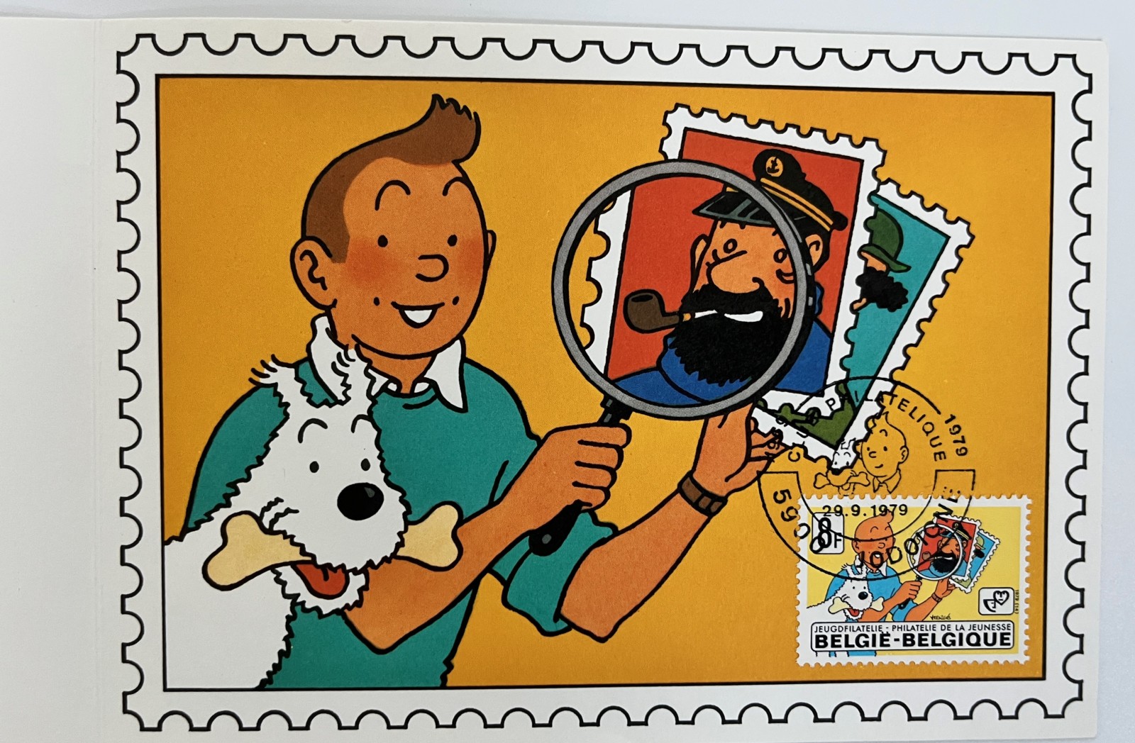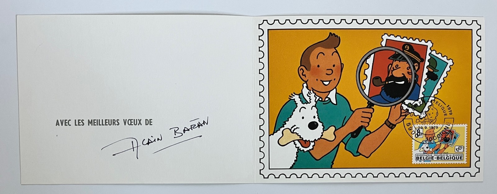 Hergé – Tintin – Carte de voeux – Reproduction Timbre philatélie de la jeunesse – Signée par Alain Baran – 1980