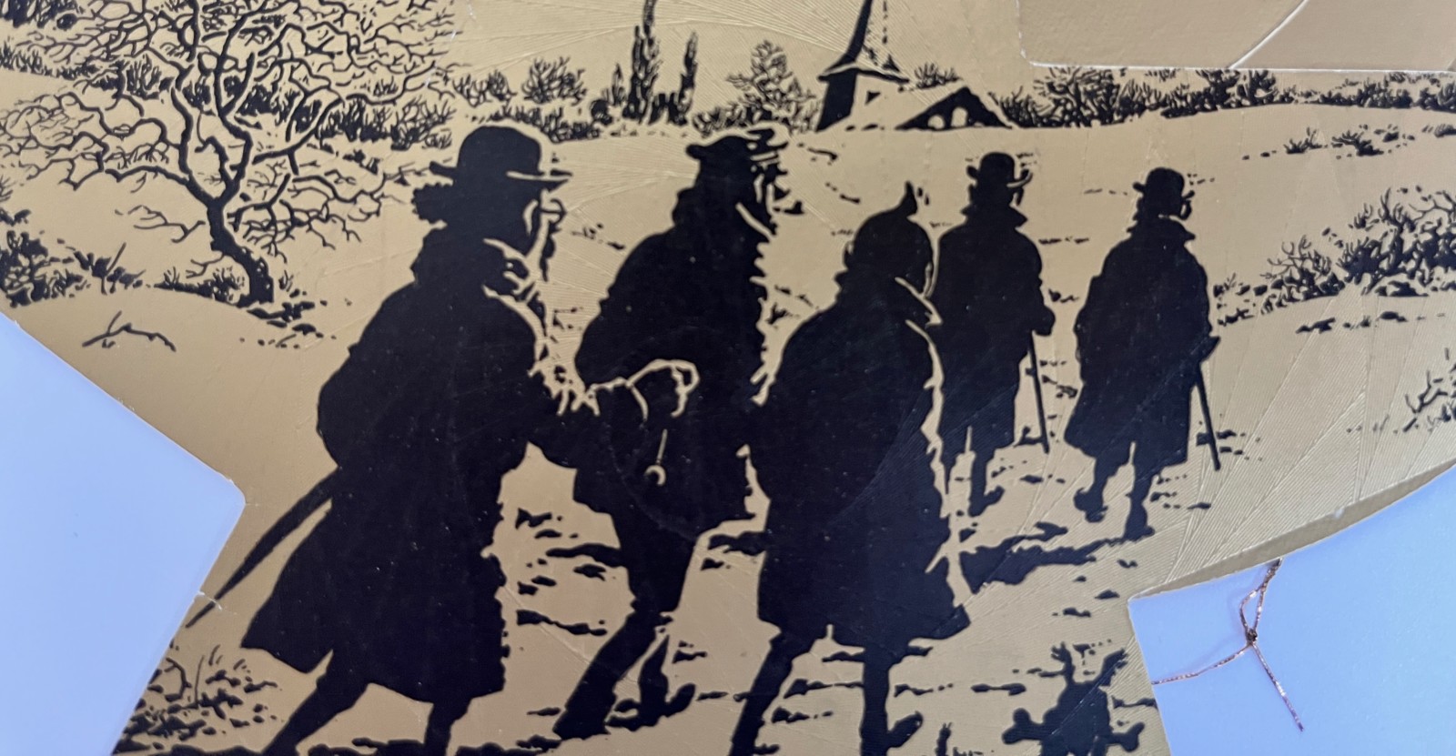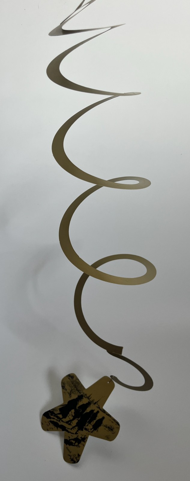 Carte de voeux en carton doré – Etoile attachée à une spirale qui se déplie une fois accrochée – Avec impression de Tintin et ses amis en contre lune et en route vers la messe de minuit