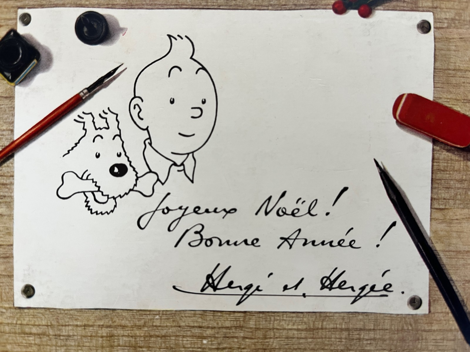 Signée par Hergé et Hergée – Le texte ‘Joyeux Noël et bonne année’ est imprimé