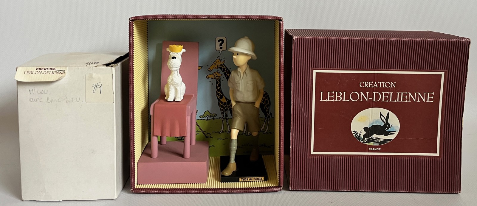 Dans sa boite d’origine gaufrée bordeaux avec fond décor  Avec la boite d’origine en kraft blanche pour Milou