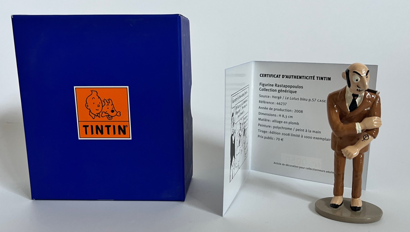 Figurine inspirée des Aventures de Tintin Le Lotus Bleu – Collection Moulinsart Plomb: Collection générique – Tirage limité numéroté à 1500 exemplaires (1000 exemplaires pour le premier tirage et ensuite 500 nouveaux exemplaires en 2010) – Avec son certificat