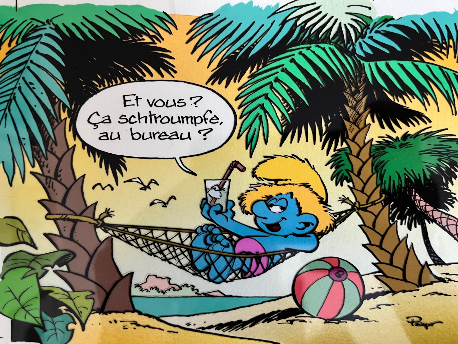 Peyo – Les Schtroumpfs – Au bureau- Bleu de coloriage et film noir – (années 80)