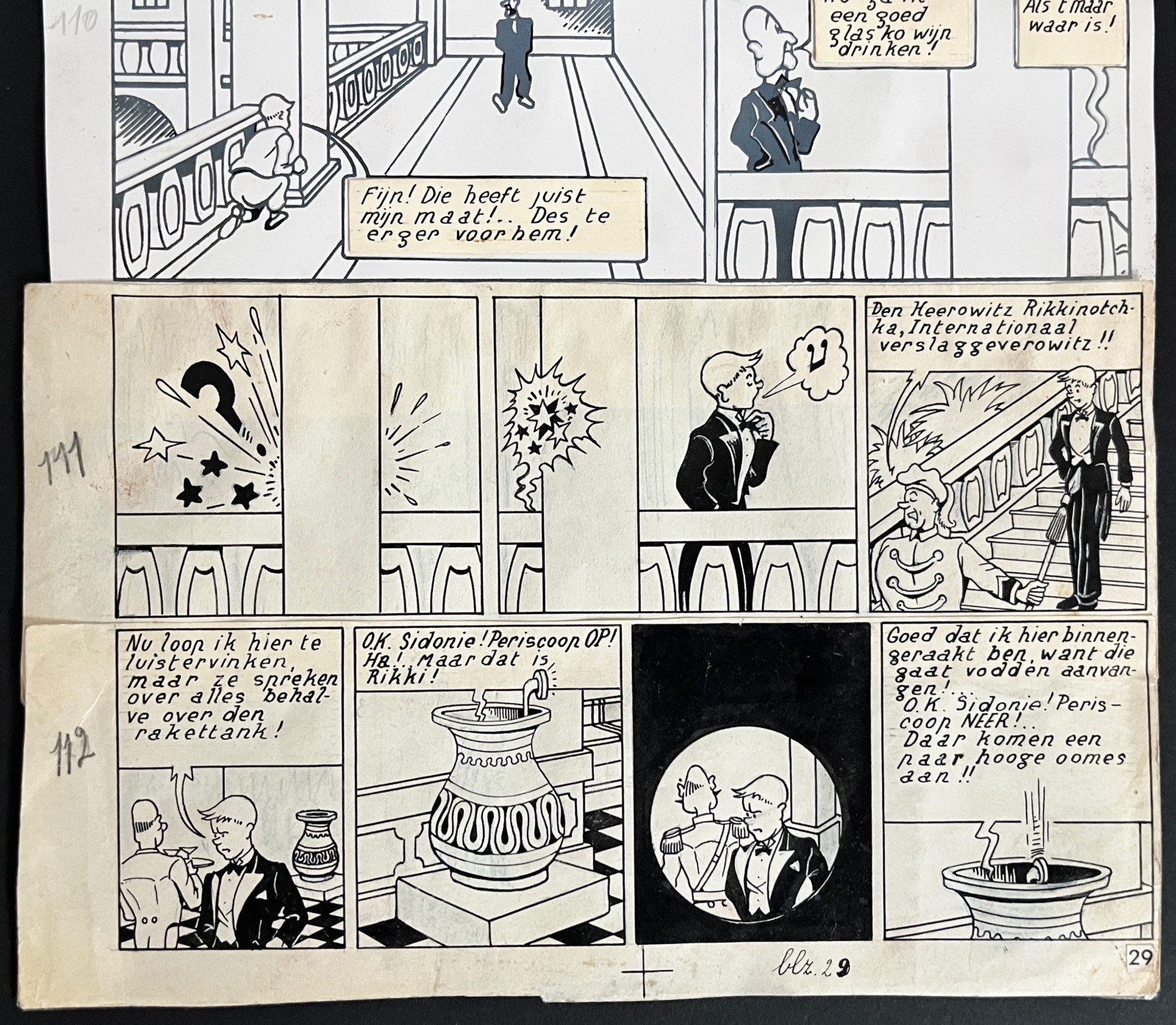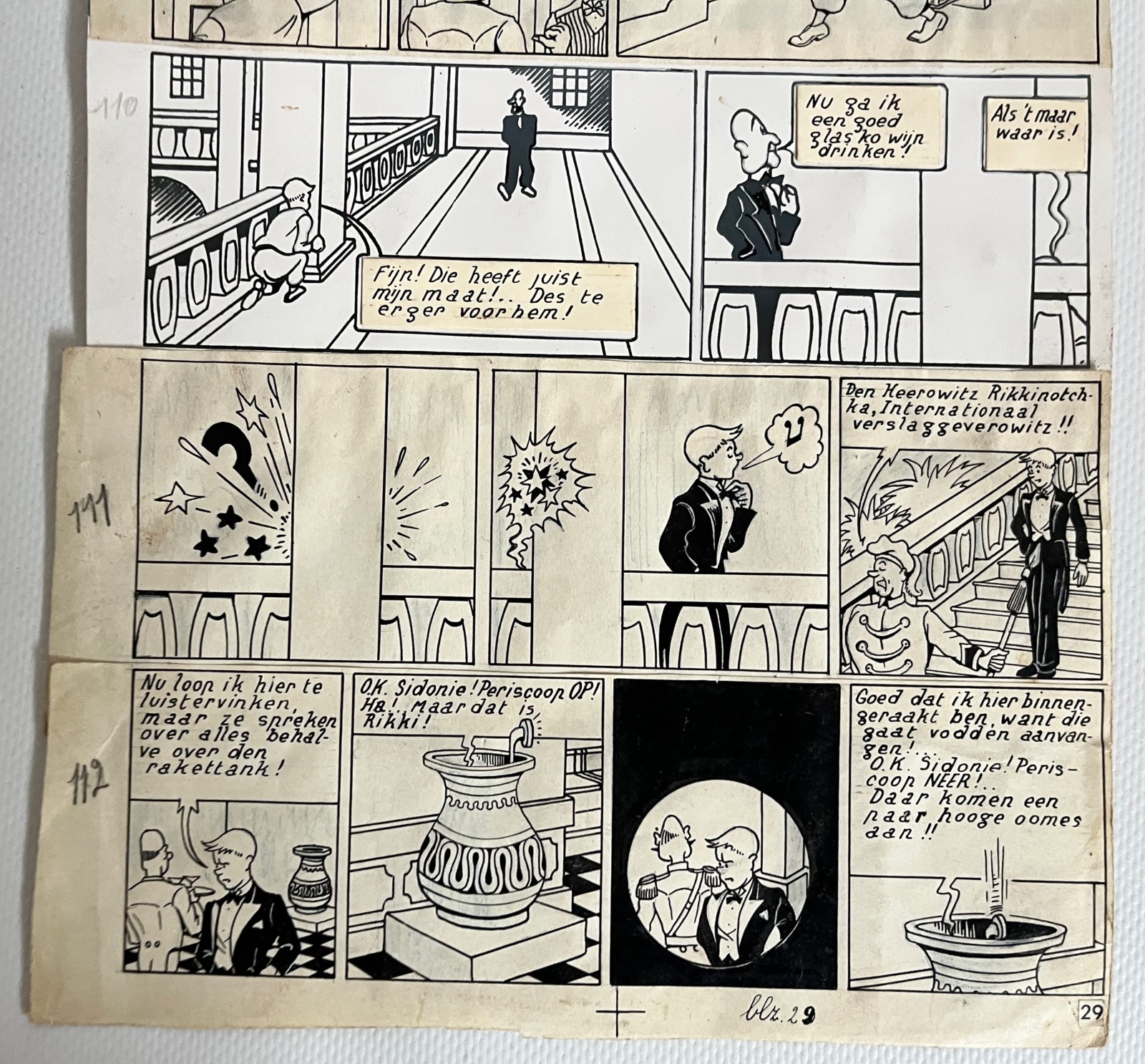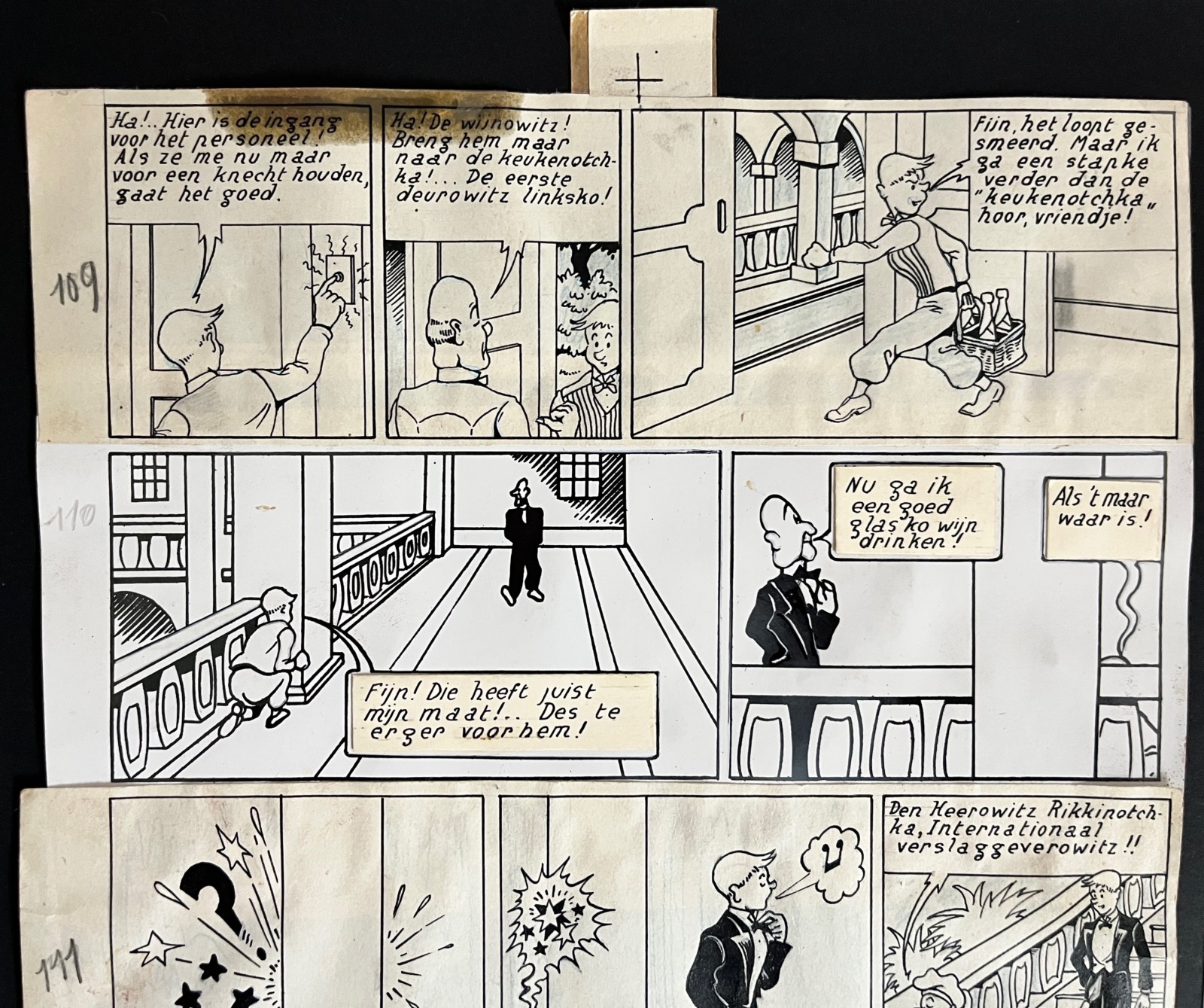 Encre de chine et crayon bleu – Strips 109 à 112 – Le second strip a été initialement perdu et a du être redessiner par Willy Vandersteen, ce qui explique la différence de papier