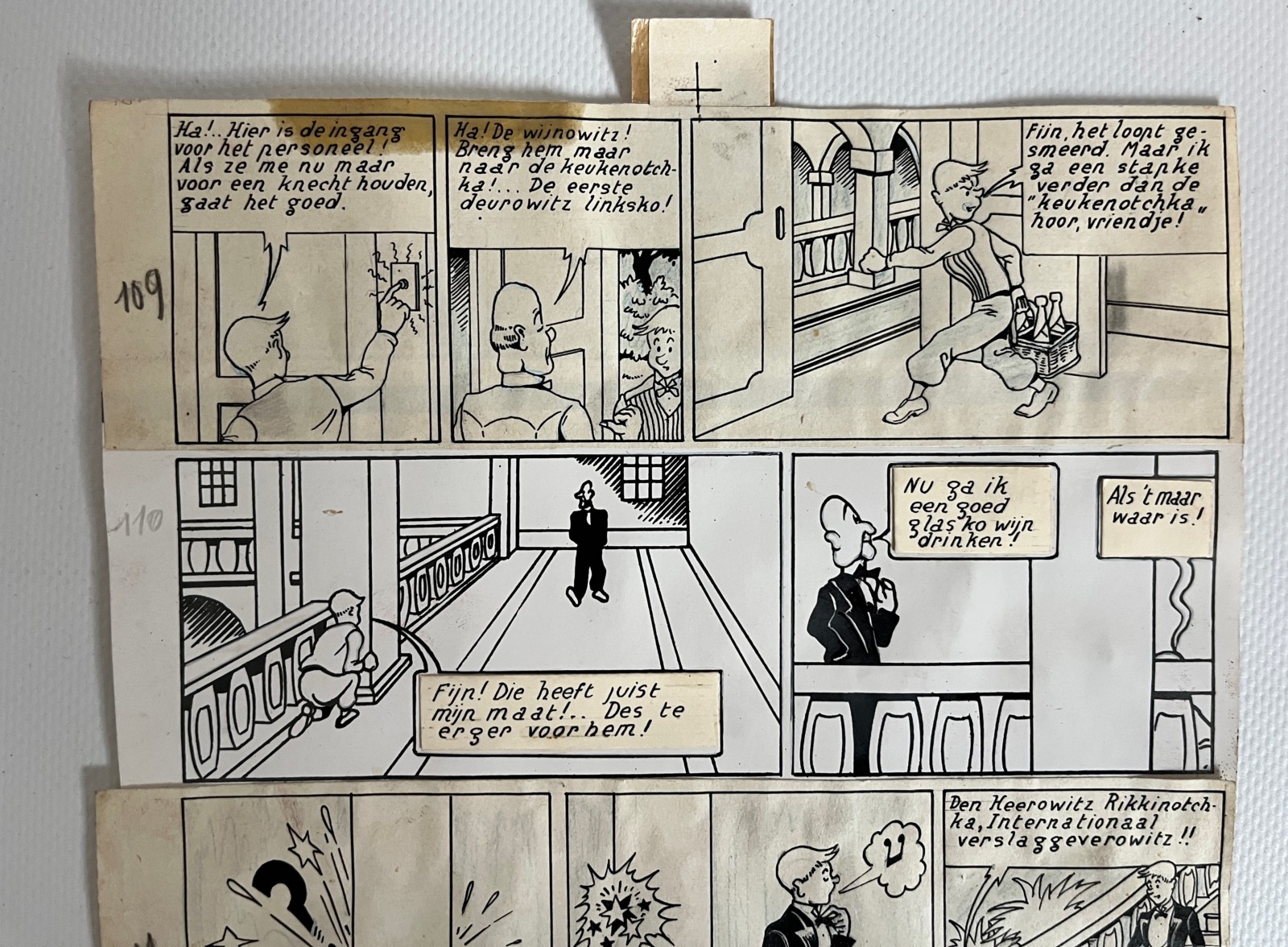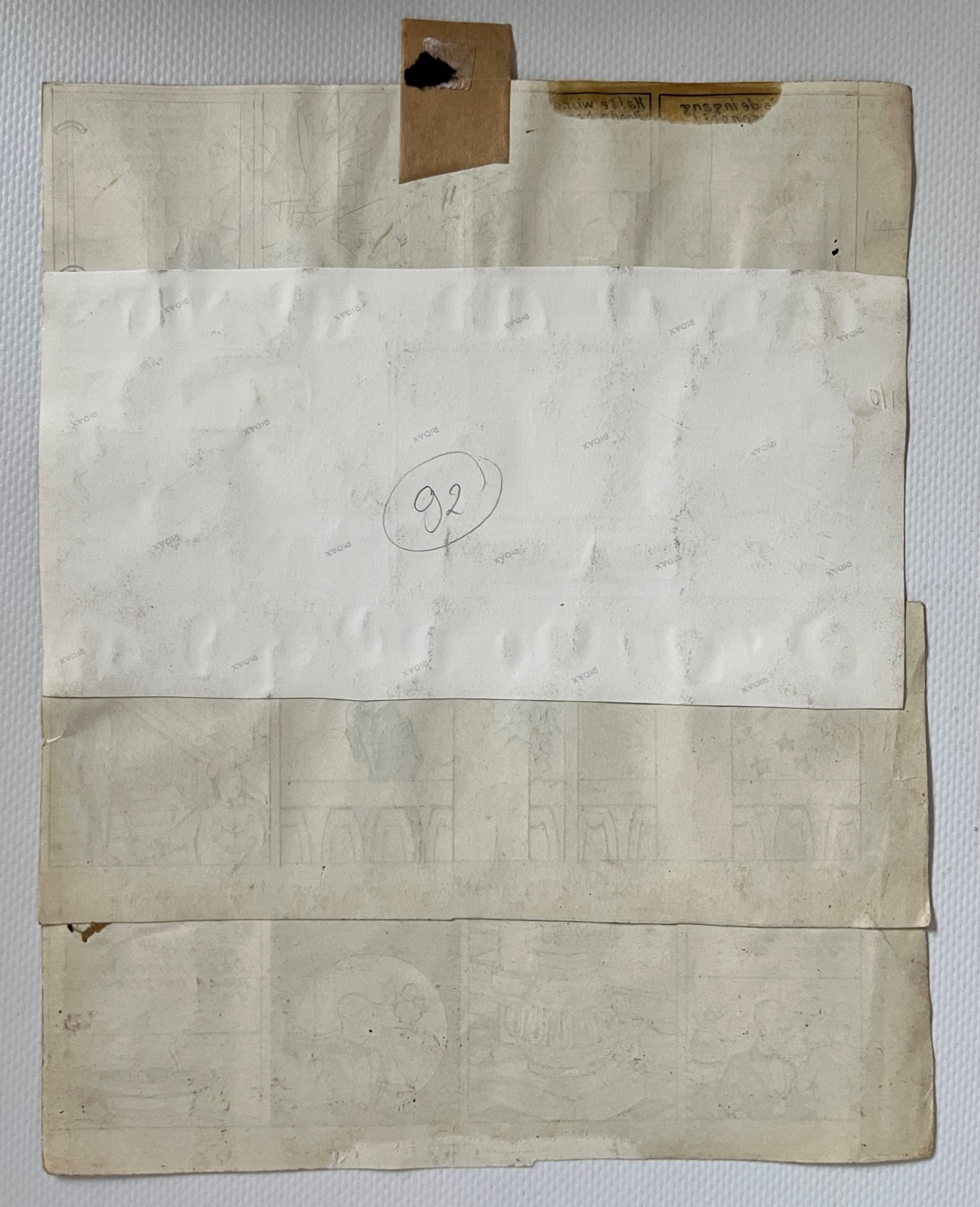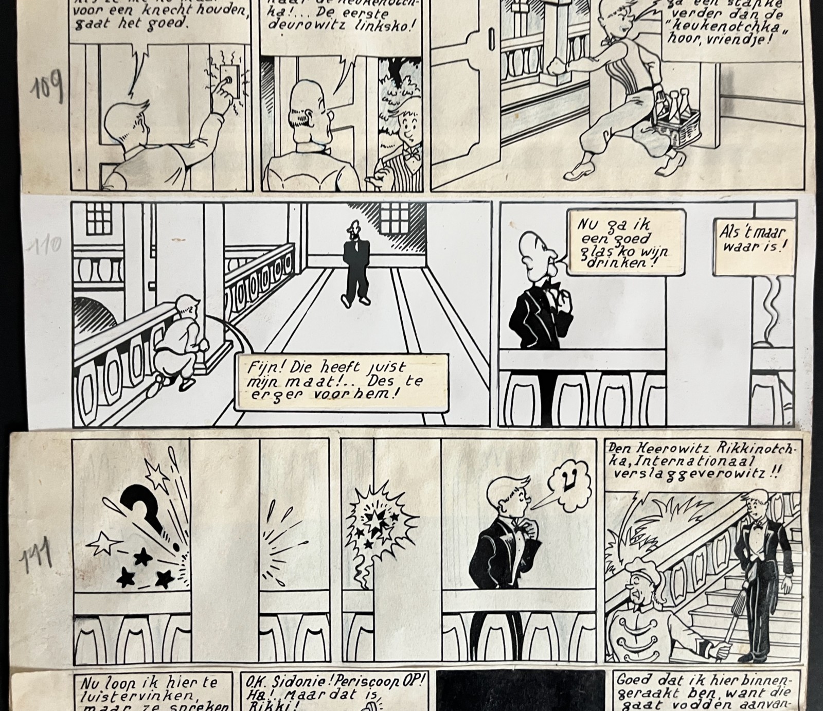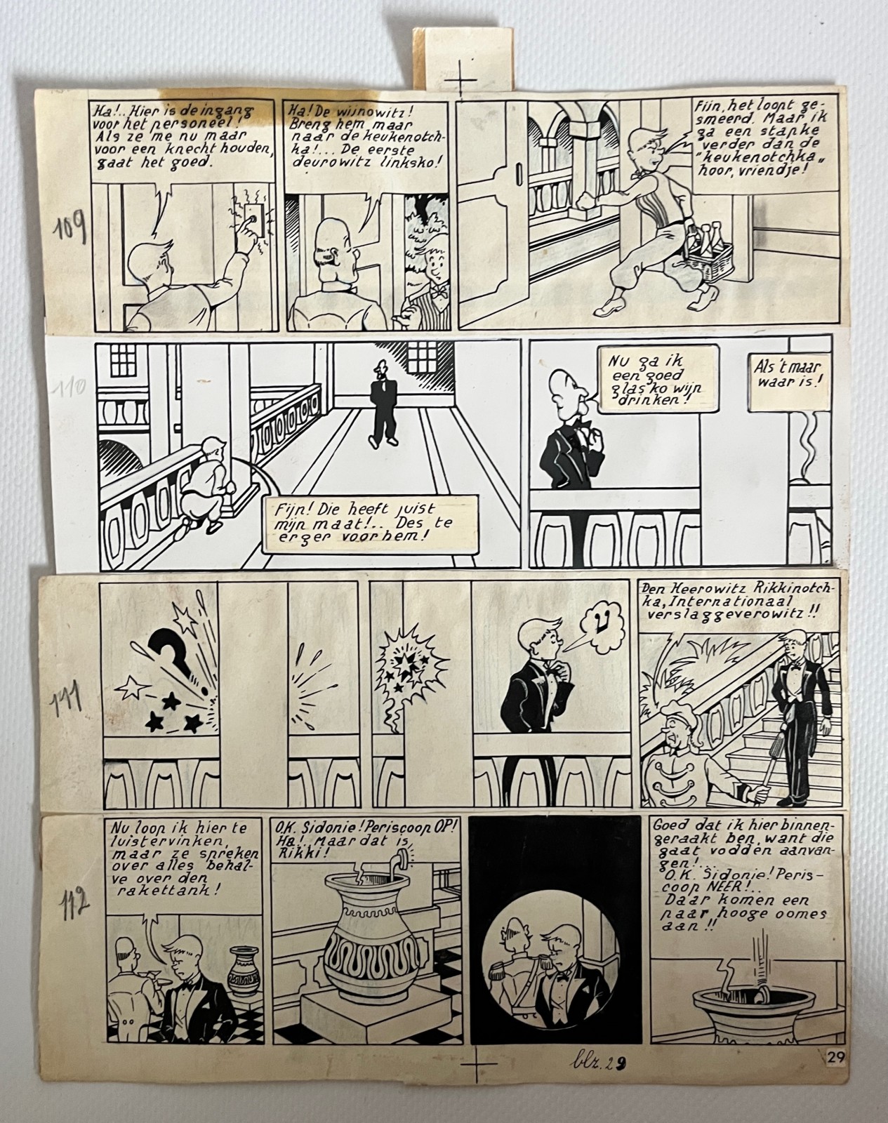 Encre de chine et crayon bleu – Strips 109 à 112 – Le second strip a été initialement perdu et a du être redessiner par Willy Vandersteen, ce qui explique la différence de papier