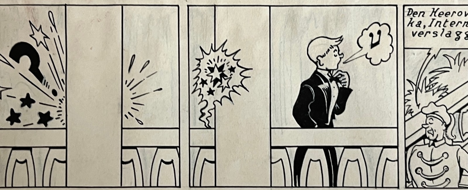 Encre de chine originale pour une page de Rikki en Wiske, le premier album de Suske en Wiske (qui porte le numéro 154 dans la série actuelle – Ecrit et dessiné par Willy Vandersteen et publié dans De Nieuwe Standard du 30 mars au 15 décembre 1945 sous le titre De Adventuren van Rikki en Wiuske –