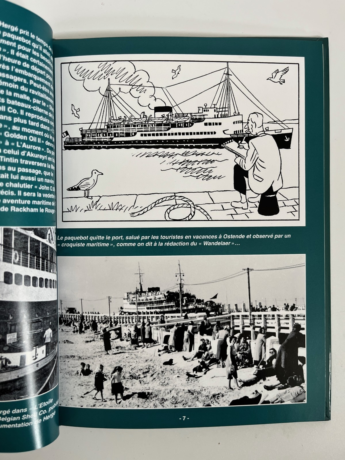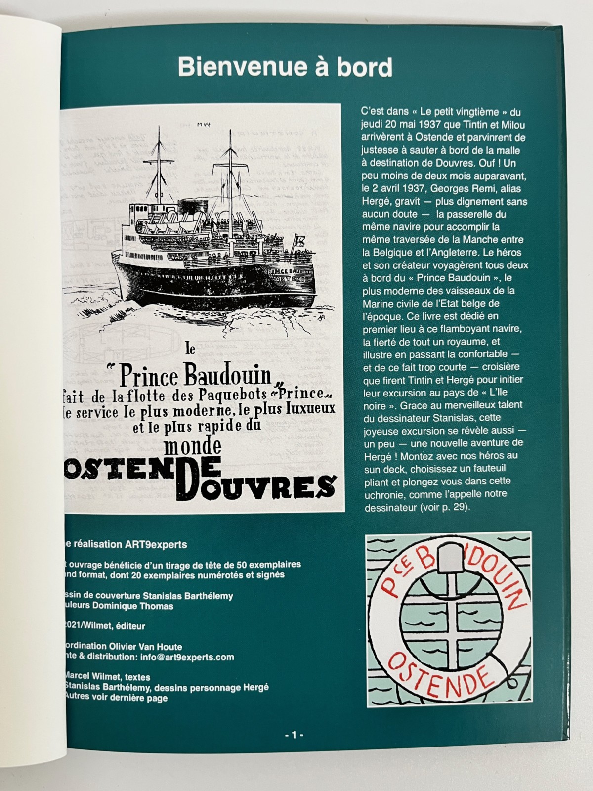 Un histoire de 38 pages en images et photos historiques – L’ouvrage est dédié au navire Le Prince Baudouin, un des malles reliant la Belgique à l’Angleterre en 1937, année ou Hergé et Tintin montèrent à bord, en route pour L’Ile Noire